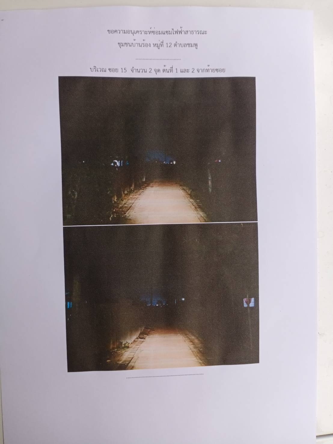 รายละเอียดของเรื่อง : ขอความอนุเคราะห์ซ่อมแซมไฟฟ้าสาธารณะ บริเวณซอย15 จำนวน 2 จุด ต้นที่1 และต้นที่2 จากท้ายซอยและภายในบ้านร้องต้นธง ด้านทิศใต้ของศาลาอเนกประสงค์ |