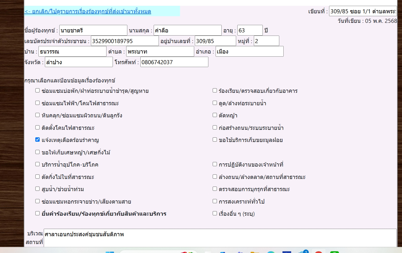 รายละเอียดของเรื่อง : ตามที่ข้าฯ ได้ร้องเรียนเหตุเดือดร้อนรำคาญเกี่ยวกับเสียงดังจากการเปิดเพลงเต้นแอโรบิคของชุมชนสันติภาพไปแล้วเมื่อวันที่ 5 พค.68 ปัจจุบันยังไม่มีการปรับลดเสียงลงแต่ประการใด บางเพลงที่เปิดดังมากๆ เพื่อบรรเทาความเดือดร้อนดังกล่าว จึงขอให้ท่านดำเนินการตามอำนาจหน้าที่ หรือจะแนะนำให้ข้าฯ แจ้งต่อหน่วยงานไหนดี |