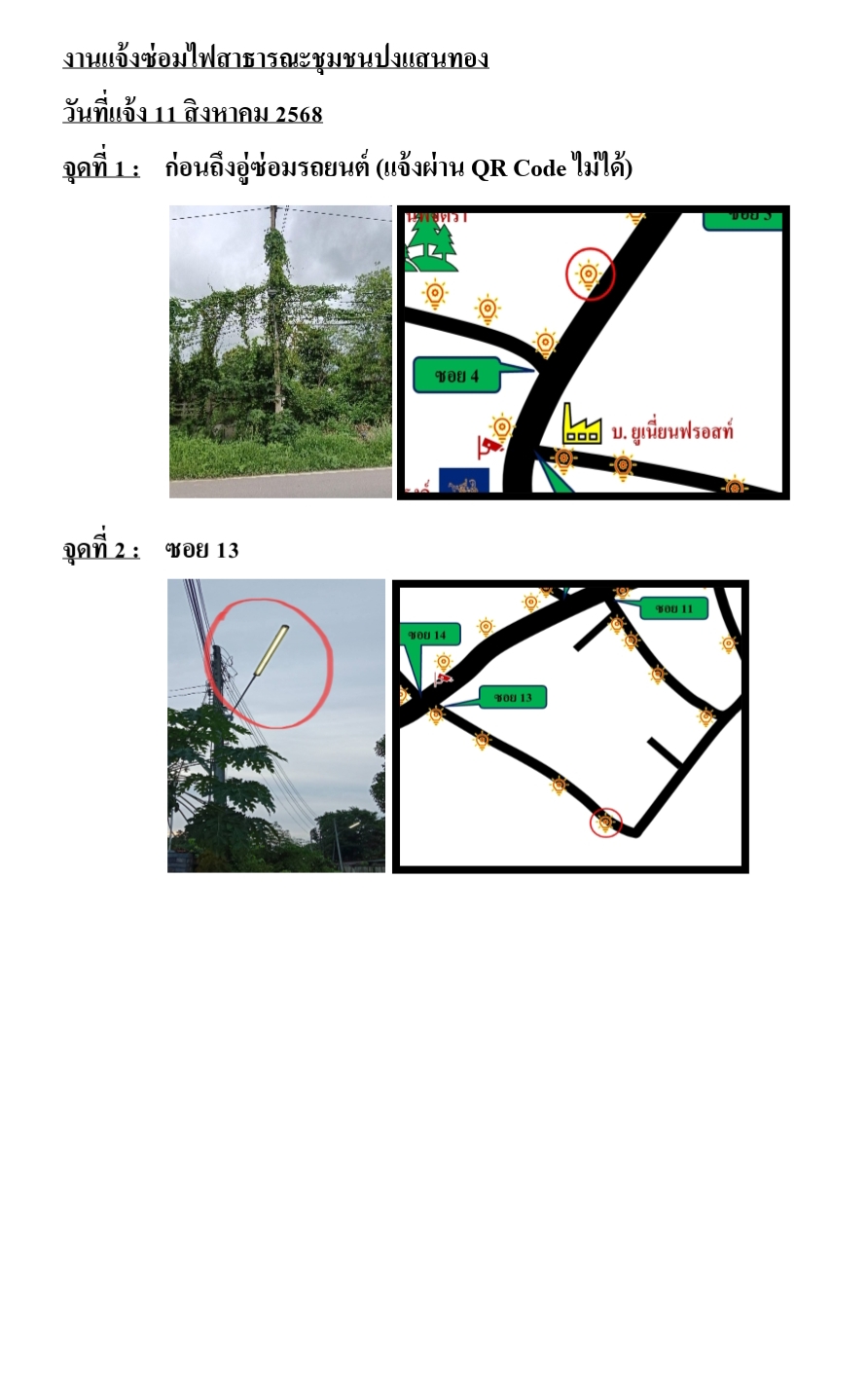 รายละเอียดของเรื่อง : ขอความอนุเคราะห์ซ่อมไฟกิ่งสาธารณะที่ชำรุดในชุมชนปงแสนทอง รายละเอียดจุดซ่อมตามเอกสารไฟล์แนบ |