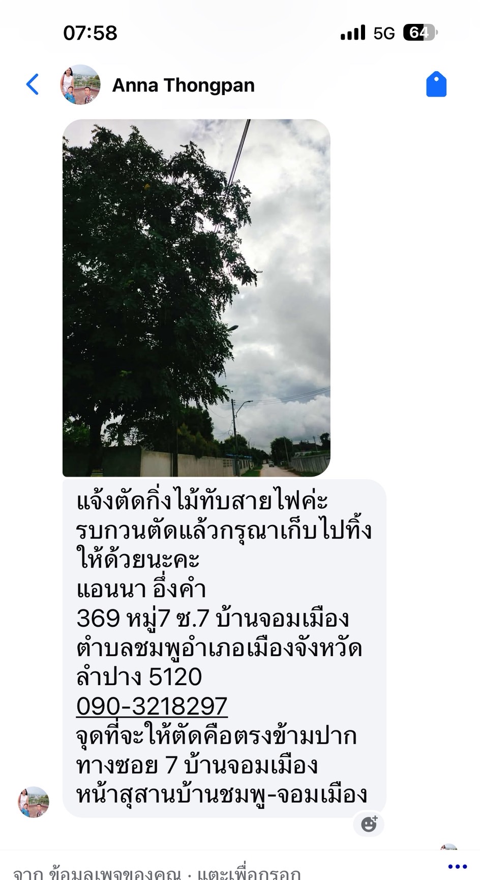 รายละเอียดของเรื่อง : ขอแจ้งตัดกิ่งไม้ทับสายไฟค่ะรบกวนตัดแล้วกรุณาเก็บไปทิ้งให้ด้วยนะคะ 369 ม.7 ซ.7 บ้านจอมเมือง ต.ชมพู อ.เมือง จ.ลำปาง 5120 จุดที่จะให้ตัดคือตรงข้ามปากทางซอย7 บ้านจอมเมืองหน้าสุสานบ้านชมพู - จอมเมือง |