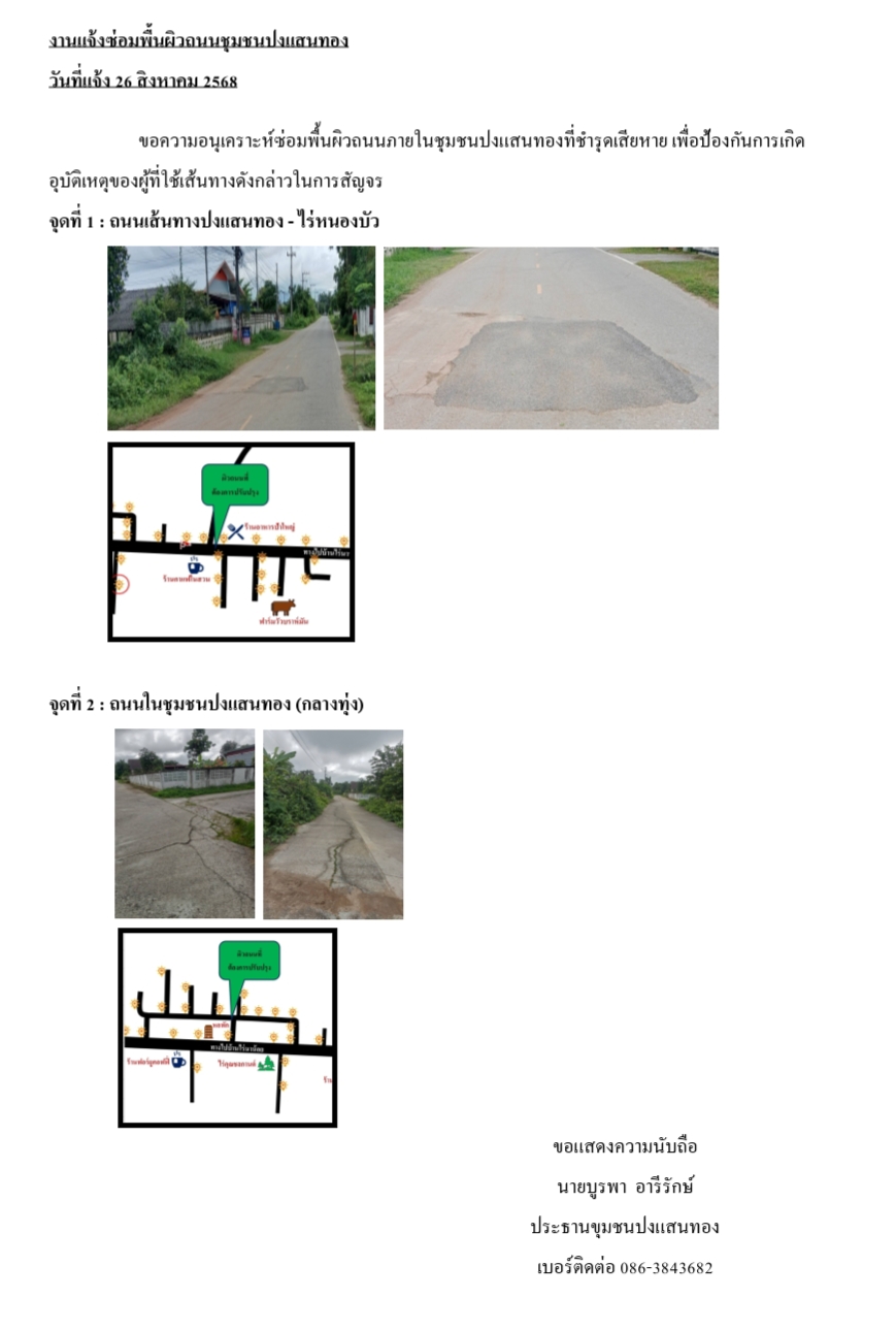 รายละเอียดของเรื่อง : ขอความอนุเคราะห์ซ่อมพื้นผิวถนนภายในชุมชนปงแสนทองที่ชำรุดเสียหาย เพื่อป้องกันการเกิดิุบัติเหตุ รายละเอียดตามเอกสารไฟล์แนบ |