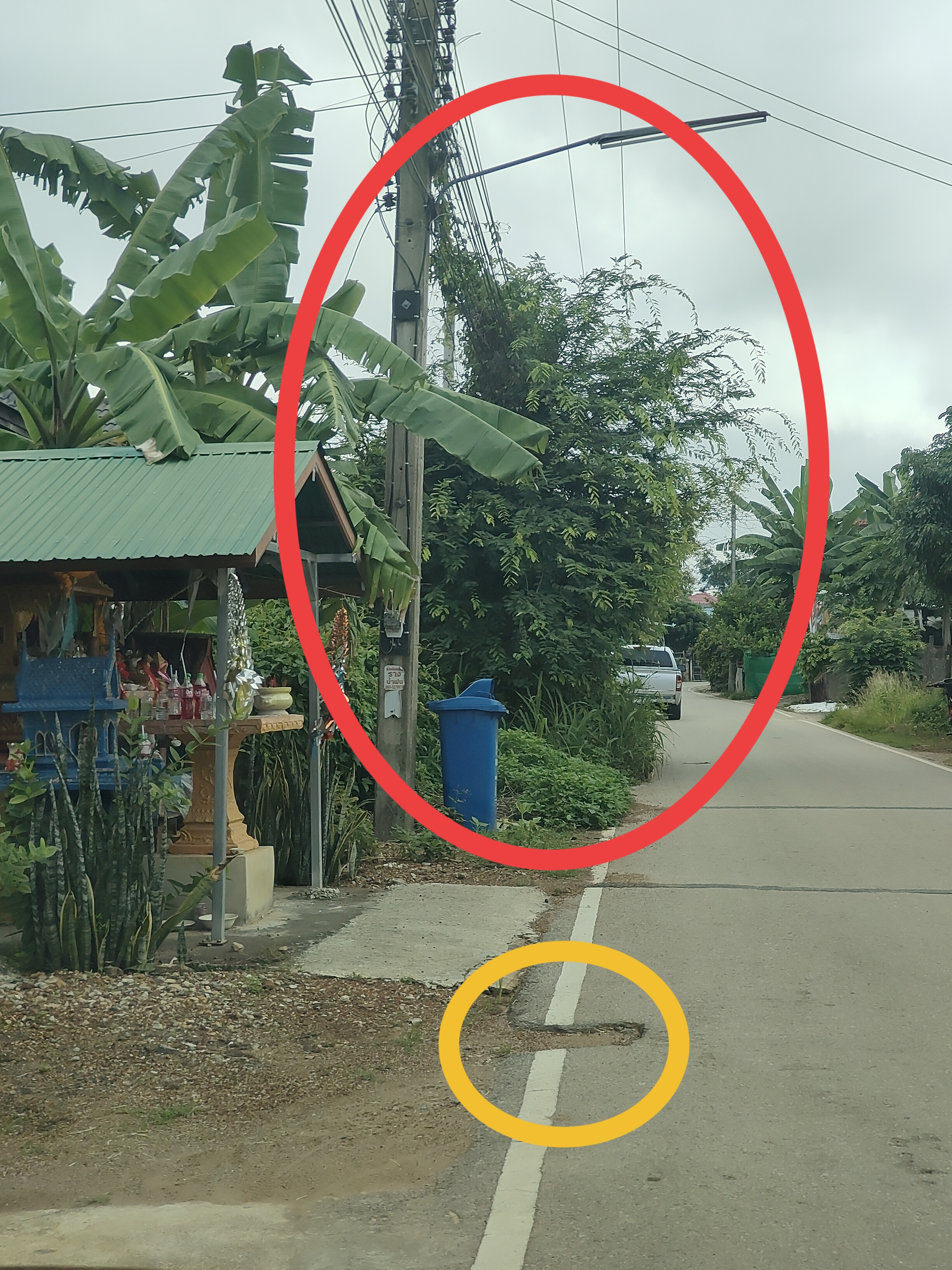 รายละเอียดของเรื่อง : วงกลมสีแดงต้นไม้สูงถึงสายไฟและยื่นออกมาถึงถนนในหมู่บ้านทำให้รถสัญจรสวนทางกันลำบาก ส่วนวงกลมสีเหลืองถนนเป็นหลุมมาตั้งนานแล้วเนื่องจากจุดเจาะวางระบบประปาภูมิภาคแต่ไม่ได้รับการถมให้เรียบร้อยเสี่ยงให้เกิดอุบัติเหตุได้ |