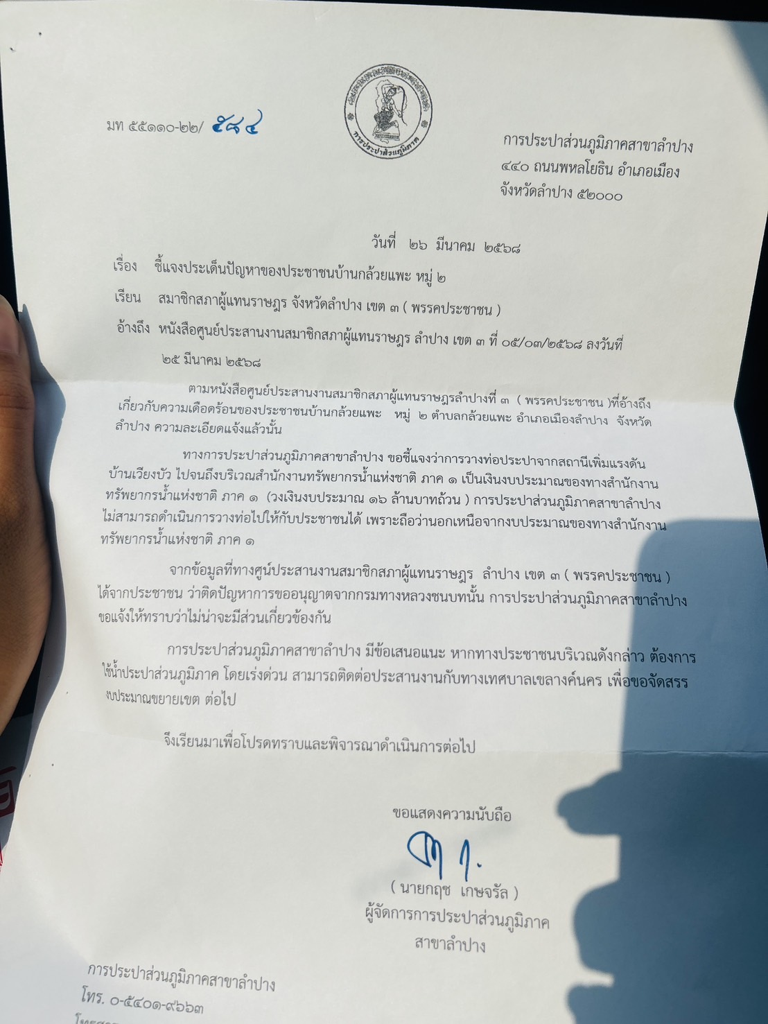 รายละเอียดของเรื่อง : ได้รับเรื่องจากประชาชนผ่านเพจ สส.ชลธานี เชื้อน้อย เรื่องการการขยายเขตประปา เนื่องจากประชาชนเห็นว่ามีการวางท่อน้ำของการประปาผ่านไปยังสำนักงานทรัพยากรน้ำแห่งชาติภาค 1 แต่เป็นการวางท่อเพียงฝั่งเดียว ทำให้ครัวเรือนที่อยู่อีกฝั่งของถนน ไม่สามารถทำเรื่องขอใช้น้ำประปาได้ (บริเวณบ้านเลขที่ 311/2) ประชาชนแจ้งว่าได้มีการทำประชาคมและเสนอเรื่องมาแล้ว จึงอยากขอความอนุเคราะห์เทศบาล กรณีที่มีเรื่องนี้บรรจุอยู่ในแผนแล้วขอให้ทางเทศบาลให้ข้อมูล เพื่อนำไปแจ้งให้กับประชานได้ทราบ กรณีที่ยังไม่มีเรื่องนี้บรรจุในแผน ขอความอนุเคราะห์เทศบาลเข้าสำรวจพื้นที่เพื่อนำบรรจุในแผนต่อไปค่ะ (รูปเอกสารตอบกลับจากการประปาส่วนภูมิภาค) |