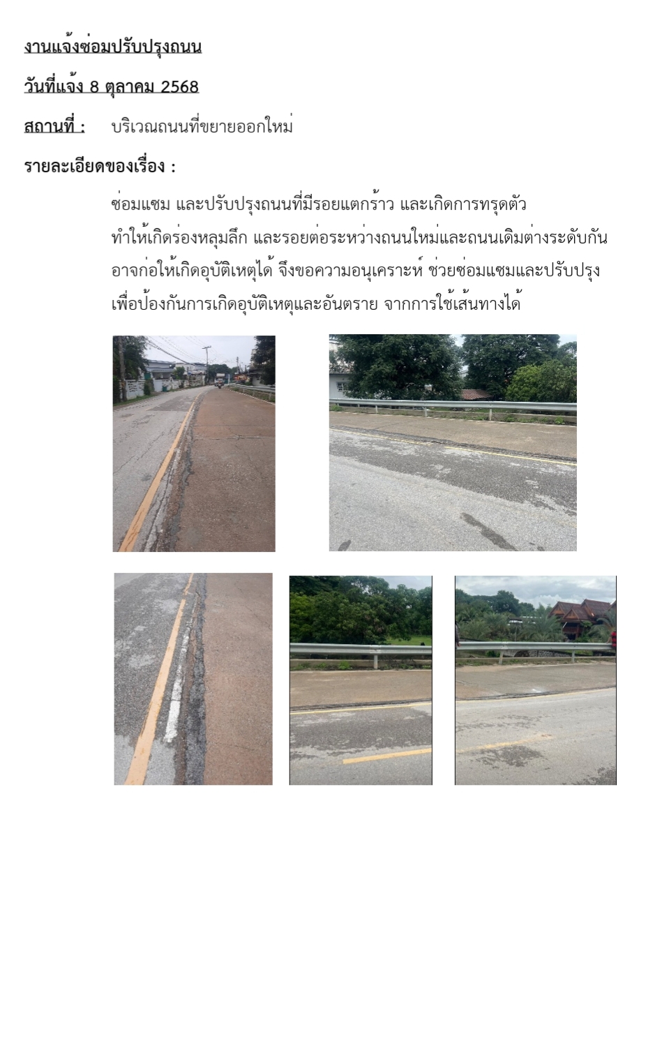 รายละเอียดของเรื่อง : ขอความอนุเคราะห์ซ่อมแซม และปรับปรุงลาดยางแอสฟัสท์ถนนที่มีรอยแตกร้าว และเกิดการทรุดตัว ทำให้เกิดร่องหลุมลึก และรอยต่อระหว่างถนนใหม่และถนนเดิมต่างระดับกัน เพื่อป้องกันการเกิดอุบัติเหตุและอันตราย จากการใช้เส้นทางได้ |