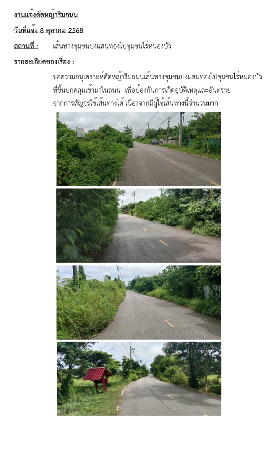 รายละเอียดของเรื่อง : ขอความอนุเคระห์ตัดหญ้าริมถนนที่ขึ้นปกคลุมเข้ามาในบริวณทางสัญจร อาจทำให้เกิดอุบัติเหตุแก่ผู้ใช้เส้นทางได้ |