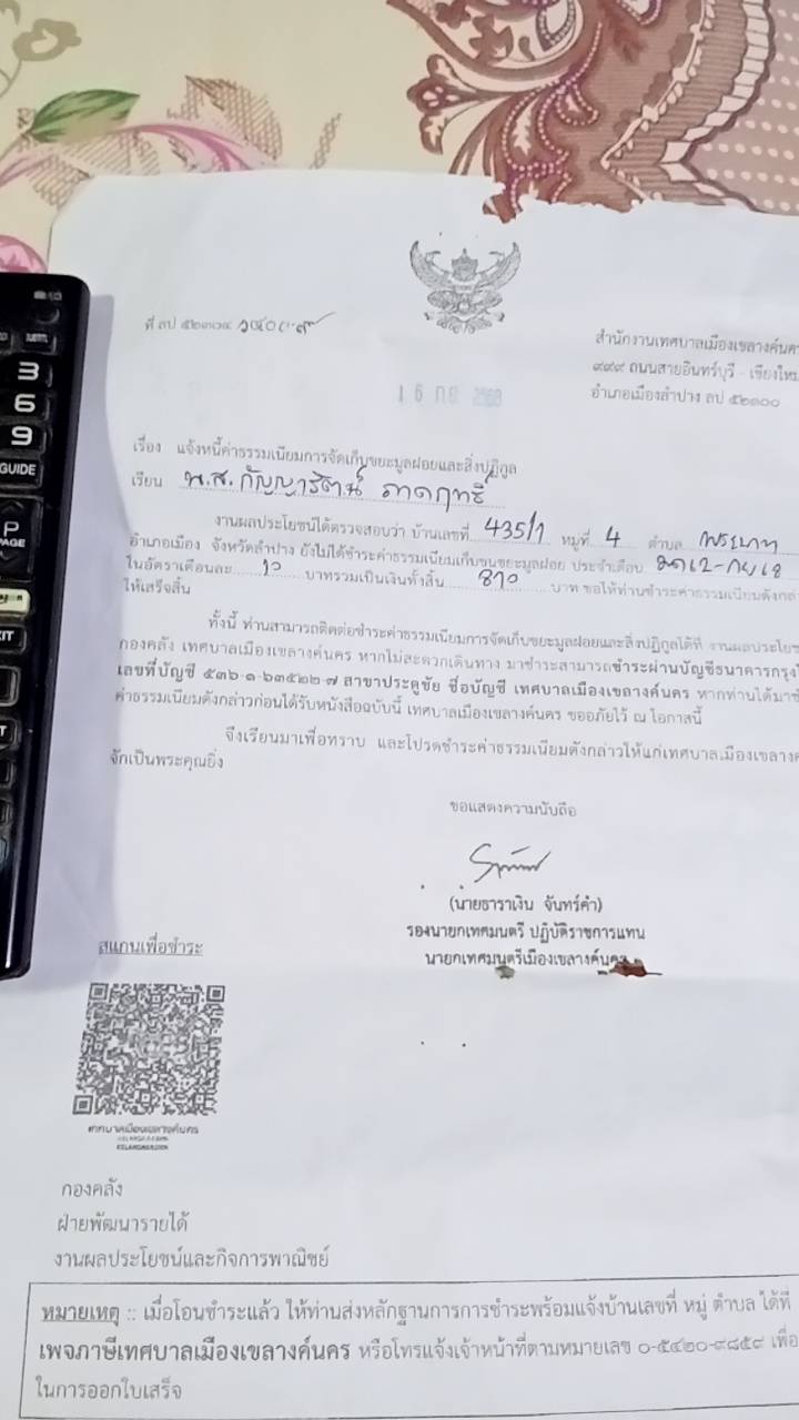 รายละเอียดของเรื่อง : ได้รับหนังสือแจ้งเรียกเก็บค่าธรรมเนียมจัดเก็ลขยะมูลฝอย