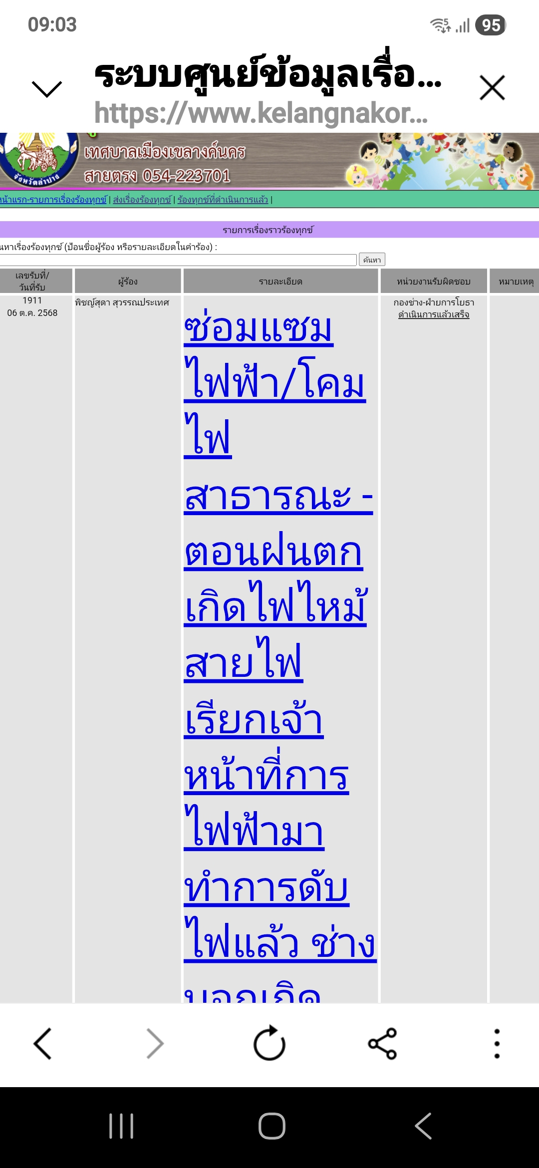 รายละเอียดของเรื่อง : ได้แจ้งเทศบาลไปแล้ว และได้เข้าไปดู เขียนว่าดำเนินการเรียบร้อยแล้ว แต่กลับมาดูที่เสาหน้าบ้าน ยังมืดมาเป็นเกือบเดือนแล้ว ยังไม่ได้รับการแก้ไขแต่อย่างใด เส้นนี้ถนนมืดและรถสัญจรเยอะ การไฟฟ้าและสายสื่อสารมาเช็ควันเกิดเหตุแล้ว บอกยังมีไฟฟ้าค้างสายไฟของเทศบาลอยู่ กลัวจะเกิดเหตุเหมือนเดิมเกิดขึ้น |