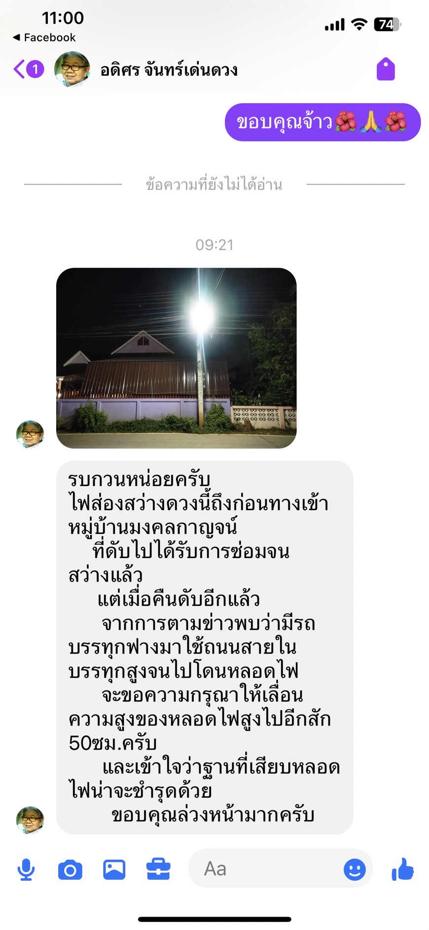 รายละเอียดของเรื่อง : ขออนุเคราะห์ไฟส่องสว่างดวงนี้ถึงก่อนทางเข้าหมู่บ้านมงคลกาญจน์ที่ดับไปได้รับการซ่อมจนสว่างแล้ว แต่เมื่อคืนดับอีกแล้วจากการตามข่าวพบว่ามีรถบรรทุกฟางมาใช้ถนนสายในบรรทุกสุงจนไปโดนหลอดไฟจะขอความกรุณาให้เลื่อนความสูงของหลอดไฟสูงไปอีกสัก50 ซม.ครับ และเข้าใจว่าฐานที่เสียบหลอดไฟน่าจะชำรุดด้วยขอบคุณล่วงหน้ามากครับ |