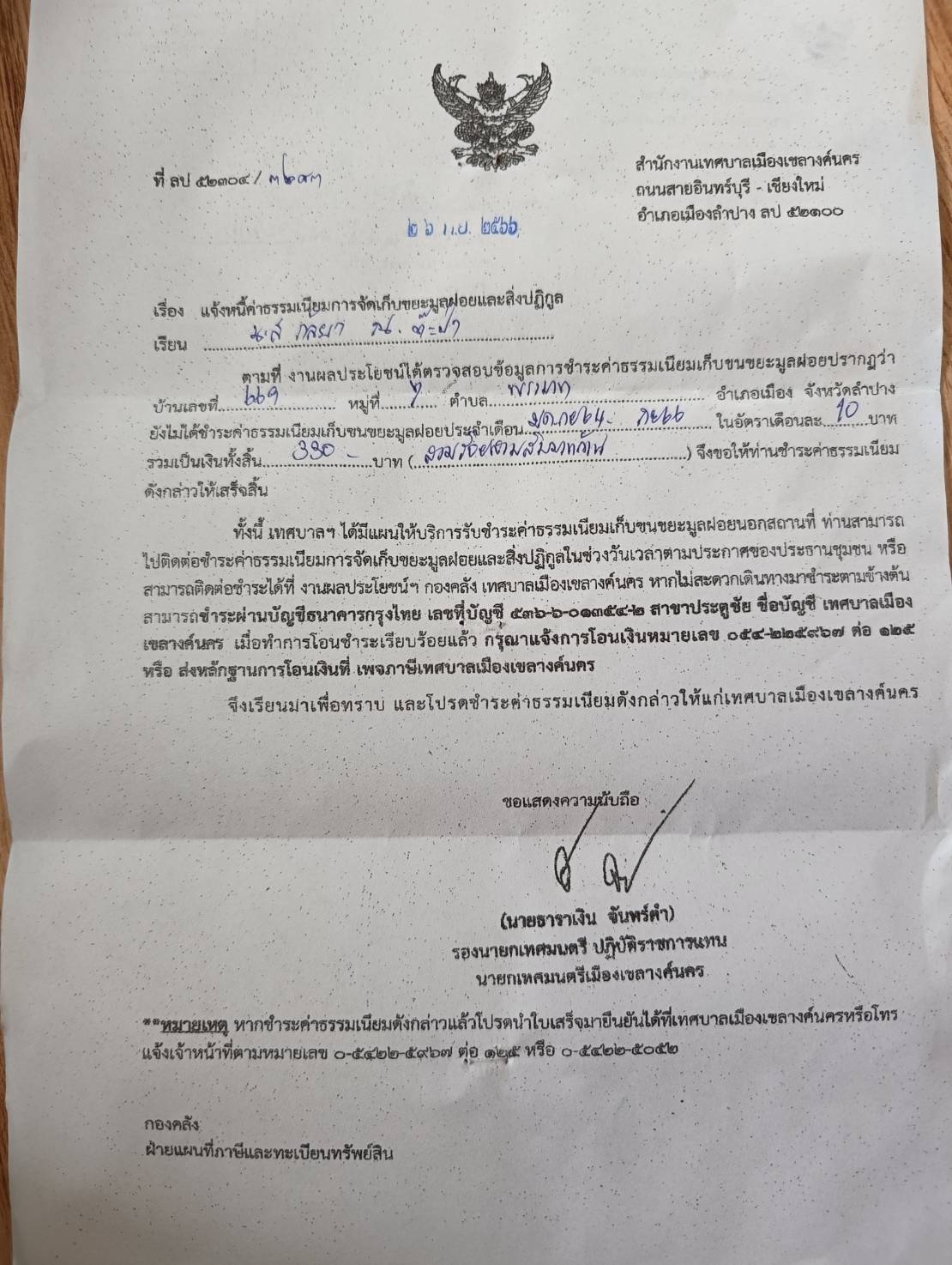 สืบเนื่องจากข้าพเจ้าได้รับเอกสารที่ ลป 52304/3283 เรื่อง แจ้งหนี้ค่าธรรมเนียมการจัดเก็บขยะมูลฝอยและสิ่งปฏิกูล ลงวันที่ 26 กันยายน 2566