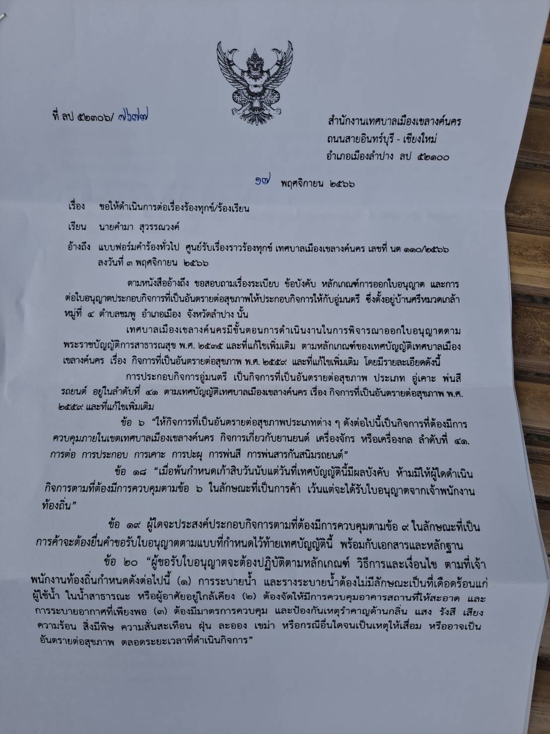 รายละเอียดของเรื่อง : เนื่องจากปัจจุบันยังได้รับผลกระทบจากการประกอบกิจของอู่มนตรีมากขึ้นกว่าเดิม จึงอยากทราบว่าเทศบาลฯ ได้ปฏิบัติให้เป็นไปตาม รายละเอียด หลักเกณฑ์ รวมถึงการออกใบอนุญาตให้อู่มนตรี ประกอบกิจการ ประกอบ ต่อ เคาะ ปะผุ พ่นสี ยานยนต์ ตาม พ.ร.บ.การสาธารณสุข พ.ศ.2535 ซึ่งเป็นกิจการที่เป็นอันตรายต่อสุขภาพ และคำแนะนำคณะกรรมการสาธารณสุข เรื่อง แนวทางควบคุมการประกอบกิจการ การเคาะ ปะผุ พ่นสียานยนต์ พศ.2559 รวมทั้งเทศบัญญัติของเทศบาลเมืองเขลางค์นคร ทุกประการ ทุกข้อหรือไม่ เช่น สถานที่ตั้งอยู่ในชุมนหรือไม่ ใกล้สถานที่ที่ต้องห้ามตามคำแนะนำคณะกรรมการฯหรือไม่ ได้ปฏิบัติตามทุกข้อใน พ.ร.บ.และแนวทางคณะกรรมการฯ หรือไม่ ฯลฯ และอยากทราบว่าเทศบาลได้ออกใบอนุญาตให้ประกอบกิจการครั้งแรกเมื่อไหร่ ให้ต่อใบอนุญาตมาแล้วกี่ครั้ง โดยให้ท่านรายงานเป็นหนังสือ และขอสำเนาใบอนุญาตครั้งแรก และปัจจุบันมาด้วย หวังว่าคงจะได้รับความกรุณาจากท่านเสมอมา |