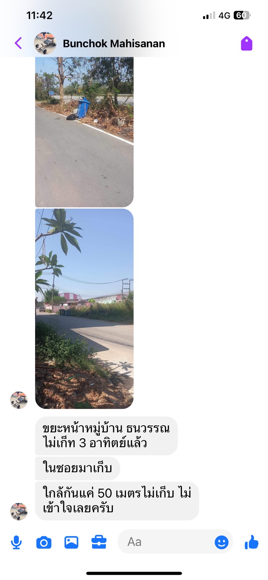 รายละเอียดของเรื่อง : ขอเก็บขยะหน้าหมู่บ้านธนวรรณไม่เก็บมา 3 อาทิตย์แล้วใกล้กันแค่ 50 เมตร ไม่เก็บไม่เข้าใจเลยครับ |