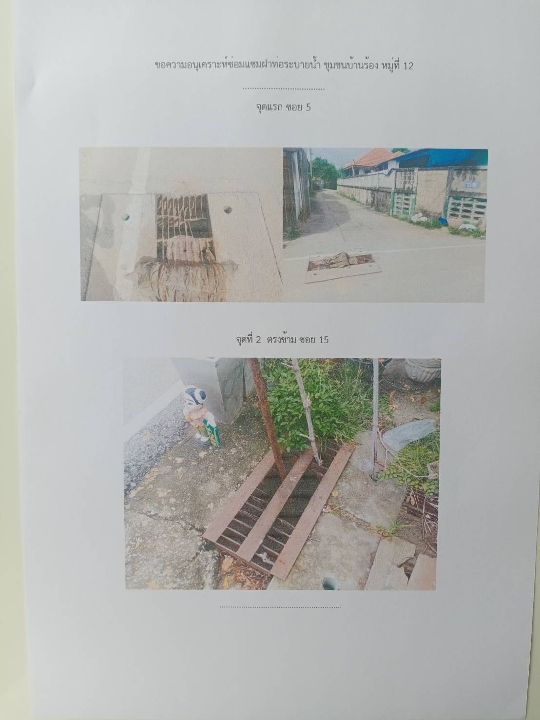 รายละเอียดของเรื่อง : ขอความอนุเคราะห์ซ่อมแซมฝาท่อระบายน้ำ เนื่องจากชำรุดเพื่อป้องกันอุบัติเหตุที่จะเกิดบริเวณซอย5 และตรงข้ามซอย15 |