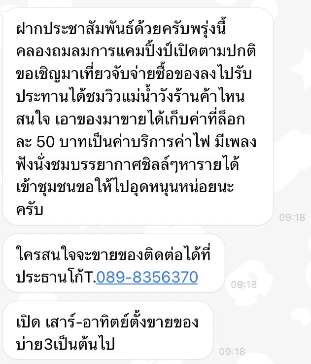 รายละเอียดของเรื่อง : ฝากประชาสัมพันธ์ พรุ่งนี้คลองถมลมการแคมปิ้งป์เปิดตามปกติ ขอเชิญมาเที่ยวจับจ่ายซื้อของลงไปรับประทานได้ชมวิวแม่น้ำวังร้านค้าไหนสนใจ เอาของมาขายได้เก็บค่าที่ล็อกละ 50 บาทเป็นค่าบริการค่าไฟ มีเพลงฟังนั่งชมบรรยากาศชิลล์ๆหารายได้เข้าชุมชนขอให้ไปอุดหนุนหน่อยนะครับ ใครสนใจจะขายของติดต่อได้ที่ประธานโก้T.089-8356370 เปิด เสาร์-อาทิตย์ตั้งขายของบ่าย3เป็นต้นไป |