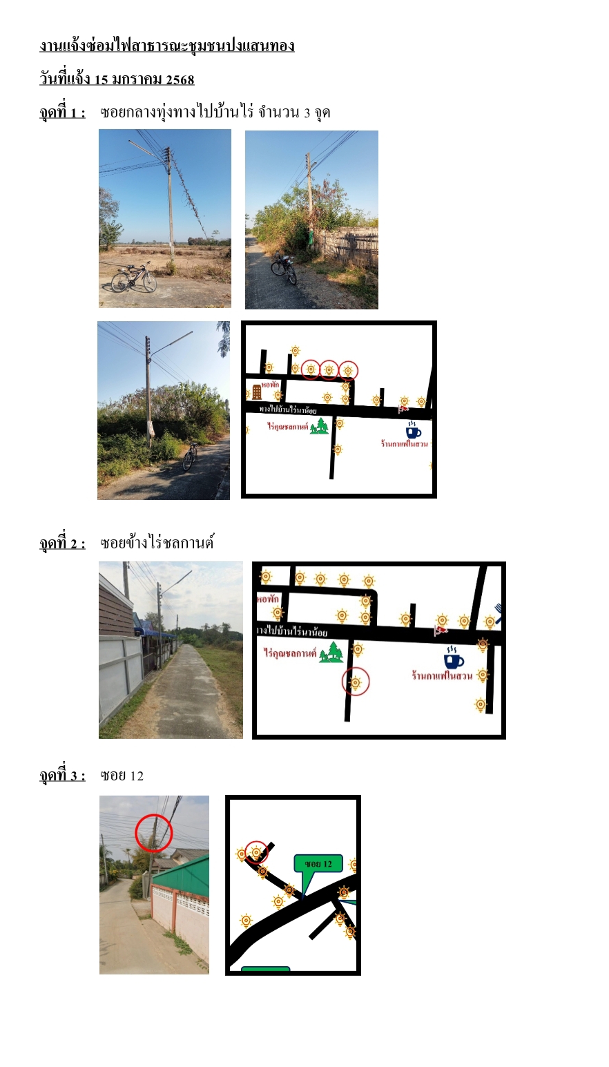 รายละเอียดของเรื่อง : ขอความอนุเคราะห์ซ่อมไฟกิ่งสาธารณะที่ชำรุดในชุมชนปงแสนทอง รายละเอียดจุดซ่อมตามเอกสารไฟล์แนบ |