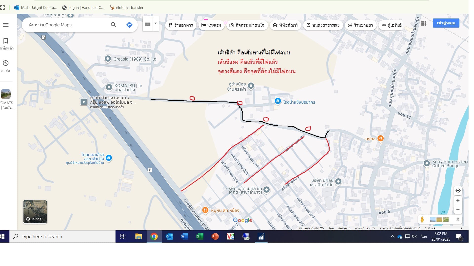 รายละเอียดของเรื่อง : เนื่องจากได้รับเรื่องจากประชาชนในพื้นที่ผ่านเพจ สส.ชลธานี เชื้อน้อย สส.ลำปางเขต 3 อยากขอความอนุเคราะห์เทศบาลติดตั้งไฟส่องสว่างในเส้นทางเข้าชุมชนศรีสง่า บริเวณซอยข้างโคมัตซู โดยถนนเส้นดังกล่าวมืดตลอดเส้นทาง ประชาชนเกรงว่าจะเกิดความไม่ปลอดภัยต่อชีวิตและทรัพย์สิน จึงขอความอนุเคราะห์เทศบาลช่วยดำเนินการติดตั้งไฟส่องสว่างเพื่อแก้ไขปัญหาให้กับประชาชนที่ใช้เส้นทางดังกล่าว โดยจุดที่ต้องการให้มีไฟส่องสว่างได้แนบแผนที่ประกอบมาด้วย