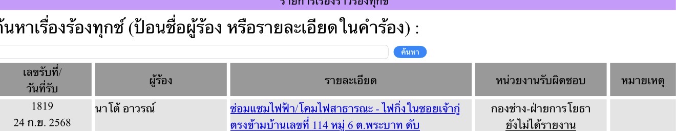 รายละเอียดของเรื่อง : หน้าบ้าน 124, 114 119 ไฟถนนดับ แจ้งไปเมื่อวันที่ 24/9/68 ยังไม่ได้รับการแก้ไขค่ะ |