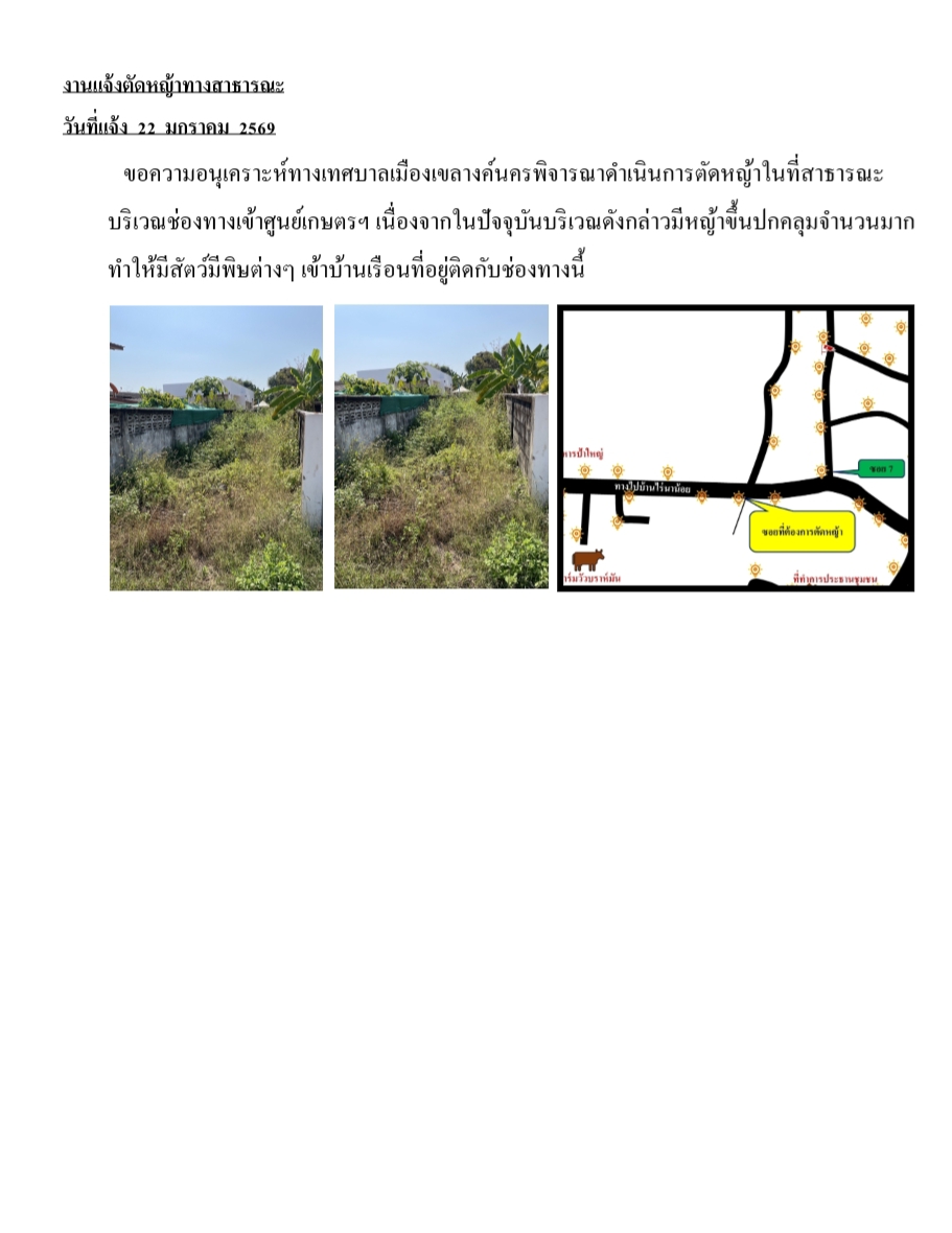 รายละเอียดของเรื่อง : ขอความอนุเคราะห์ตัดหญ้าทางสาธารณะ บริเวณที่ตัดตามเอกสารไฟล์แนบ |