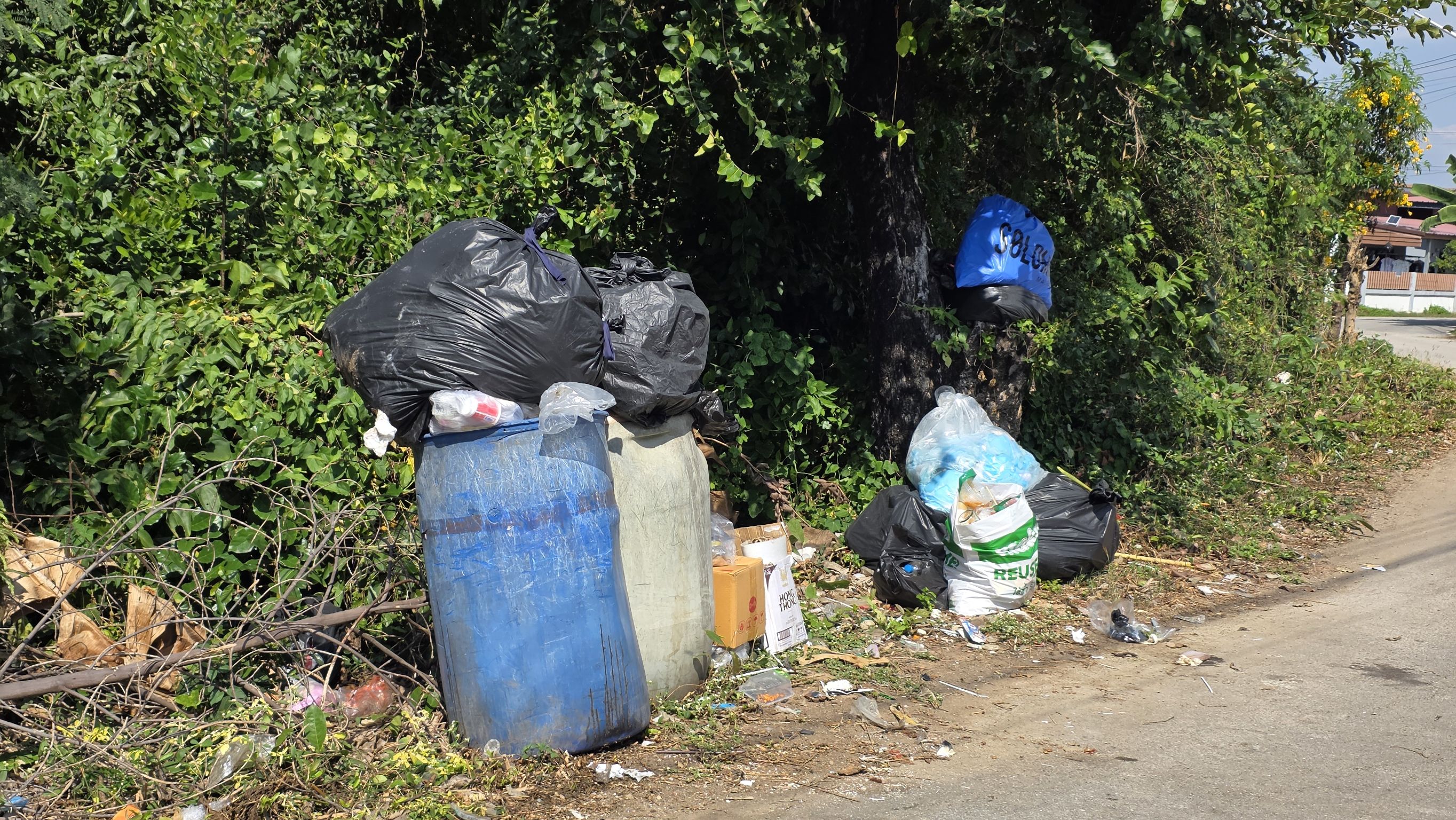ขยะล้นถัง: ปริมาณขยะมากเกินความจุของถังที่มีอยู่ ทำให้มีขยะกองอยู่บนพื้นถนนเป็นจำนวนมาก