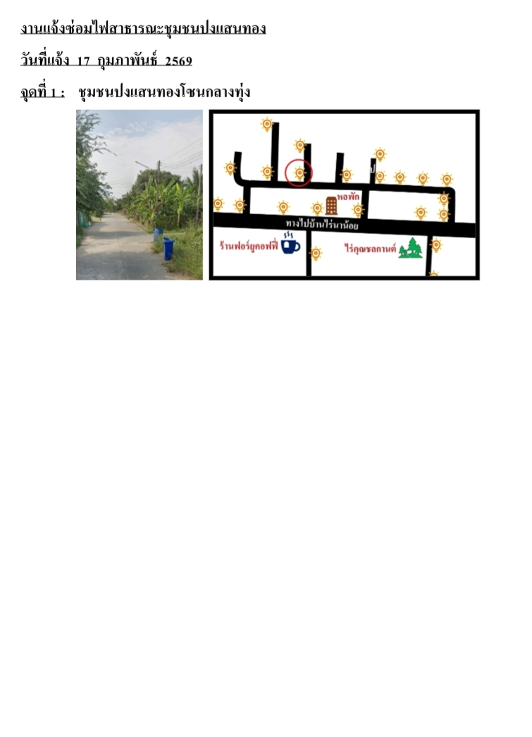 รายละเอียดของเรื่อง : ขอความอนุเคราะห์ซ่อมไฟกิ่งสาธารณะที่ชำรุดในชุมชนปงแสนทอง รายละเอียดจุดซ่อมตามเอกสารไฟล์แนบ |
