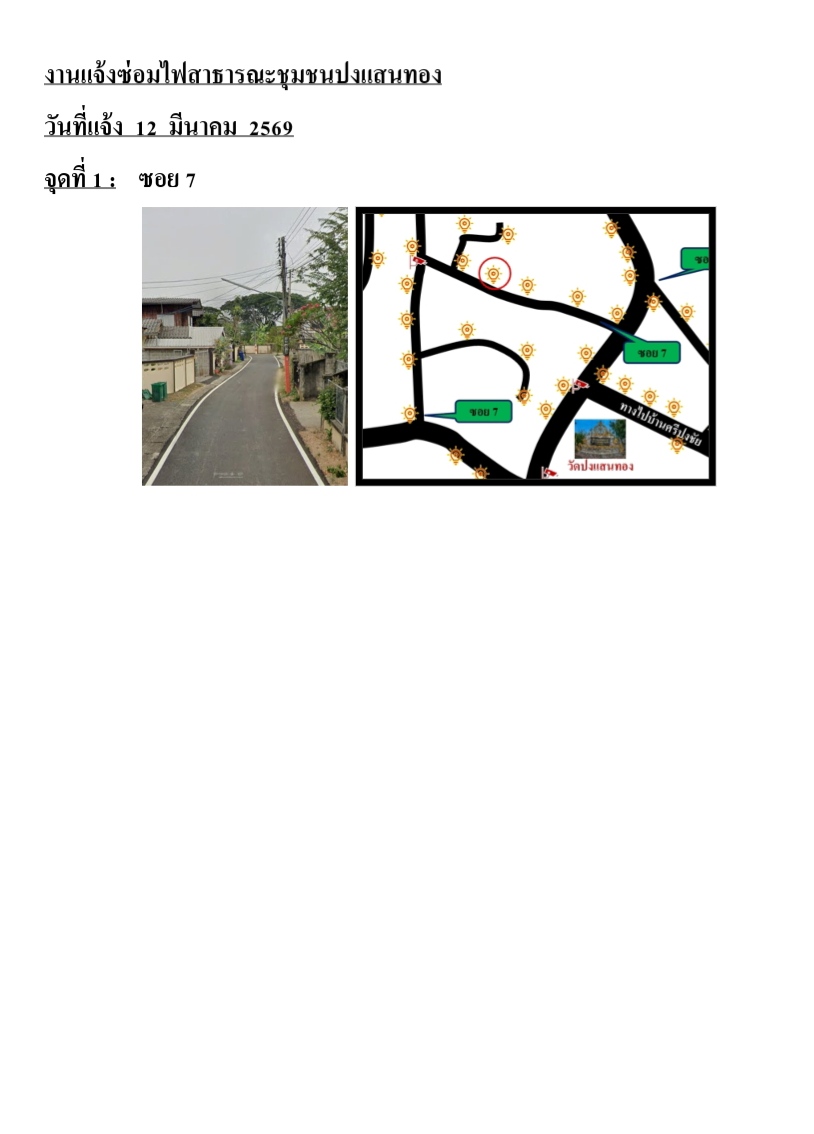 รายละเอียดของเรื่อง : ขอความอนุเคราะห์ซ่อมไฟกิ่งสาธารณะที่ชำรุดในชุมชนปงแสนทอง รายละเอียดจุดซ่อมตามเอกสารไฟล์แนบ |