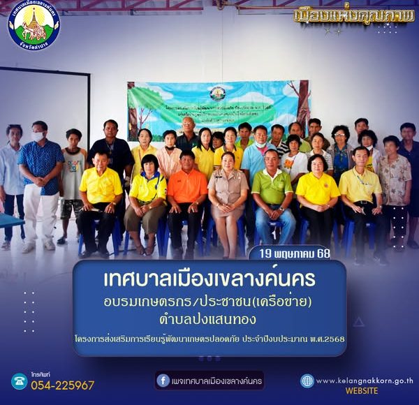วันที่ 19 พฤษภาคม 2568 เวลา 09.00 น. พ.อ.อ.ทวีผล ธรรมานุวงศ์ ปลัดเทศบาลเมืองเขลางค์นคร ปฏิบัติหน้าที่นายกเทศมนตรีเมืองเขลางค์นคร มอบหมายให้นางนัฤภร ละมัยเกตุ รองปลัดเทศบาลเมืองเขลางค์นคร เป็นประธานในพิธีเปิดการอบรมเกษตรกร/ประชาชน(เครือข่าย) ตำบลปงแสนทอง โครงการส่งเสริมการเรียนรู้พัฒนาเกษตรปลอดภัย ประจำปีงบประมาณ พ.ศ.2568 ณ ที่ทำการศูนย์บริการและถ่ายทอดเทคโนโลยีการเกษตรประจำตำบลปงแสนทอง โดยได้รับความอนุเคราะห์ทีมวิทยากร ครู ก. ตำบลปงแสนทอง