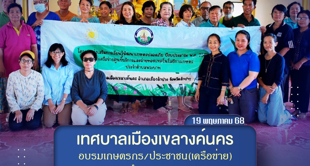 วันที่ 21 พฤษภาคม 2568 เวลา 09.00 น. พ.อ.อ.ทวีผล ธรรมานุวงศ์ ปลัดเทศบาลเมืองเขลางค์นคร ปฏิบัติหน้าที่นายกเทศมนตรีเมืองเขลางค์นคร มอบหมายให้นางนัฤภร ละมัยเกตุ รองปลัดเทศบาลเมืองเขลางค์นคร เป็นประธานในพิธีเปิดการอบรมเกษตรกร/ประชาชน(เครือข่าย) ตำบลพระบาท โครงการส่งเสริมการเรียนรู้พัฒนาเกษตรปลอดภัย ประจำปีงบประมาณ พ.ศ.2568 ณ วัดกู่แก้ว ชุมชนบ้านโทกหัวช้าง ตำบลพระบาท โดยได้รับความอนุเคราะห์ทีมวิทยากร ครู ก. ตำบลพระบาท