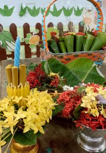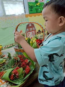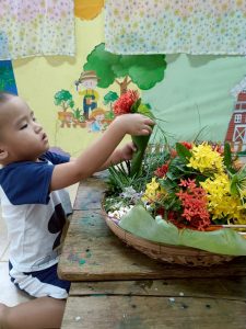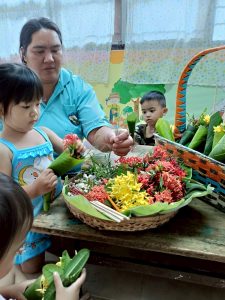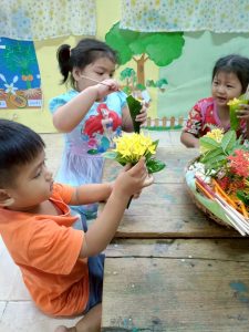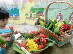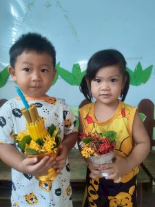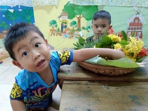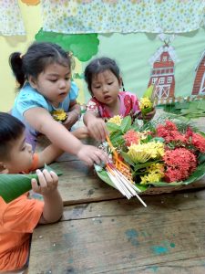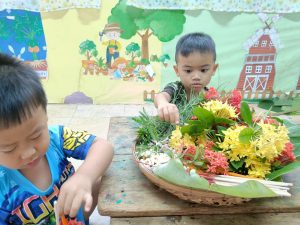 กิจกรรมทำพานไหว้ครู ให้เด็กๆเตรียม ดอกเข็ม หญ้าแพรก ดอกมะเขือ ข้าวตอก ธูปเทียน นำมาใส่กรวยไหว้ครู และ ให้ตัวแทนเด็กถือพานดอกไม้ และพานธูปเทียน นำมาเคารพ ครู เพื่อขอรับตัวเป็นลูกศิษย์