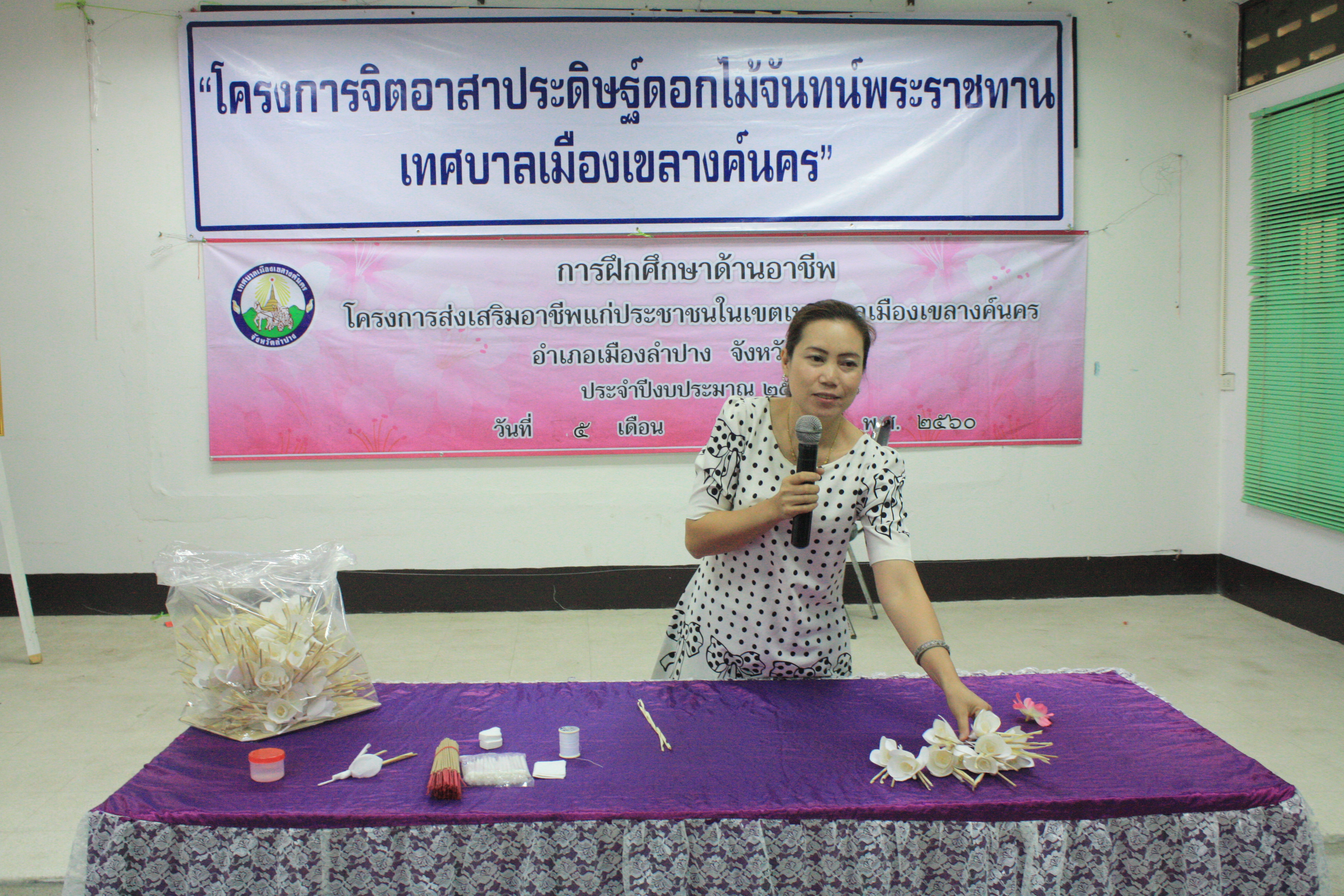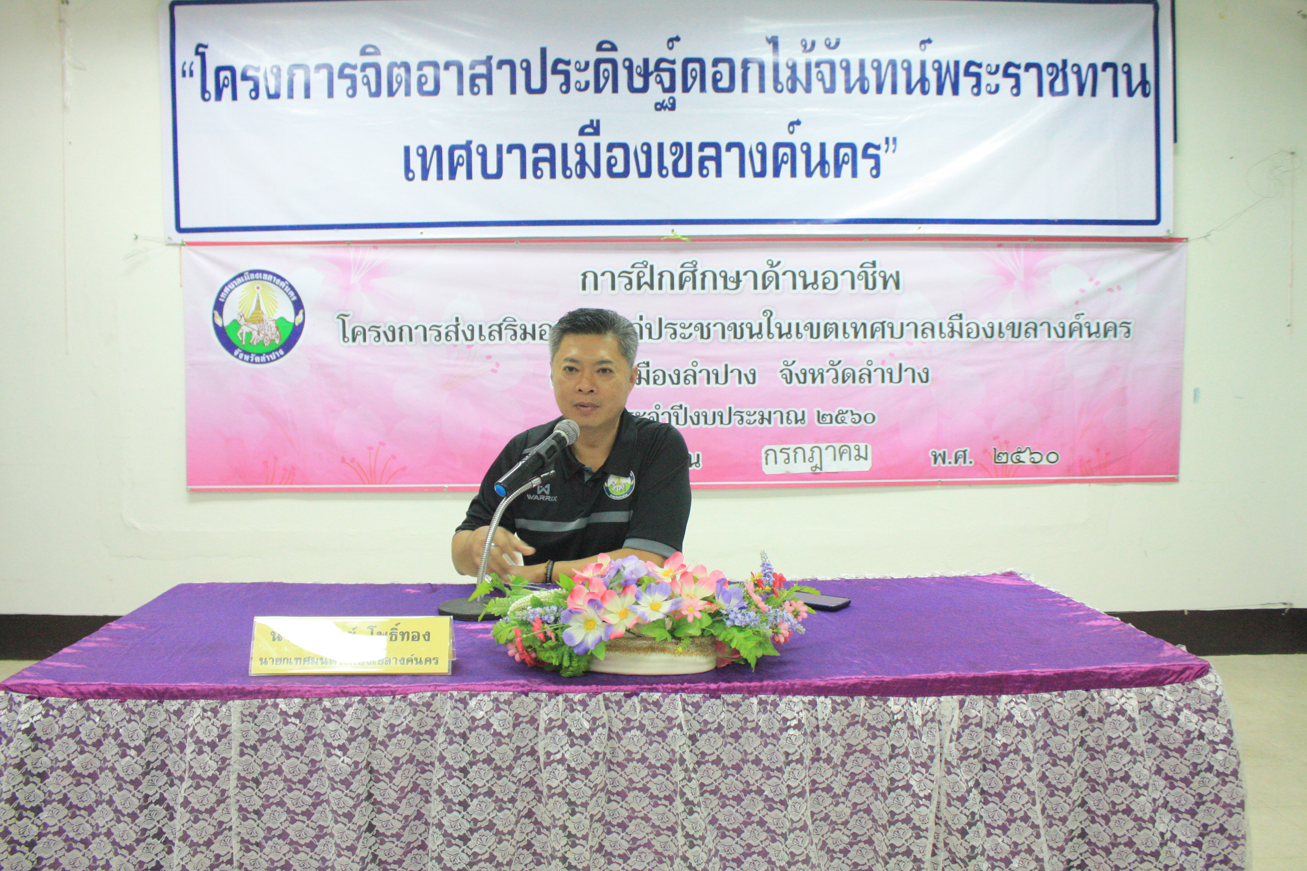 วันนี้วันที่ 5 กรกฎาคม 2560 เวลา 09.00 น.นายไพฑูรย์ โพธิ์ทอง นายกเทศมนตรีเมืองเขลางค์นคร เป็นประธานในพิธิเปิดการฝึกอบรมการทำดอกไม้จันทน์ตามโครงการส่งเสริมอาชีพแก่ประชาชนในเขตเทศบาลเมืองเขลางค์นคร เพื่อให้พนักงานเทศบาลได้ใช้เวลาว่างให้เกิดประโยชน์ และเพื่อเป็นการขานรับนโยบายของจังหวัดลำปาง ในการดำเนินกิจกรรม “โครงการจิตอาสาประดิษฐ์ดอกไม้จันทน์พระราชทาน” ในรูปแบบดอกดารารัตน์ เพื่อทูลเกล้าทูลกระหม่อมถวายในพระราชพิธีถวายพระเพลิงพระบรมศพ พระบาทสมเด็จพระปรมินทรมหาภูมิพลอดุลยเดช บรมนาถบพิตร ณ ห้องประชุมเทศบาลเมืองเขลางค์นคร (โรงเรียนบ้านดอนตันเดิม)