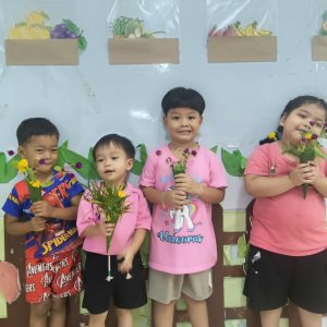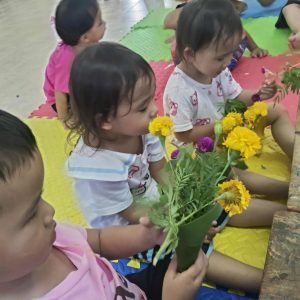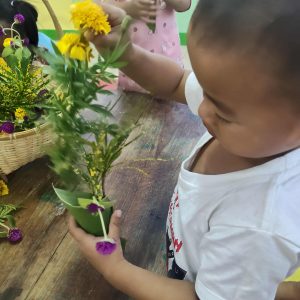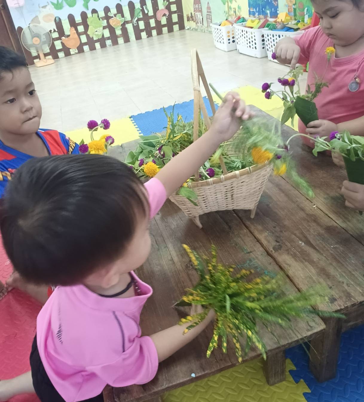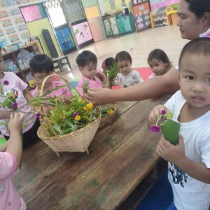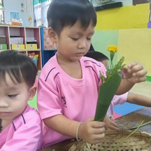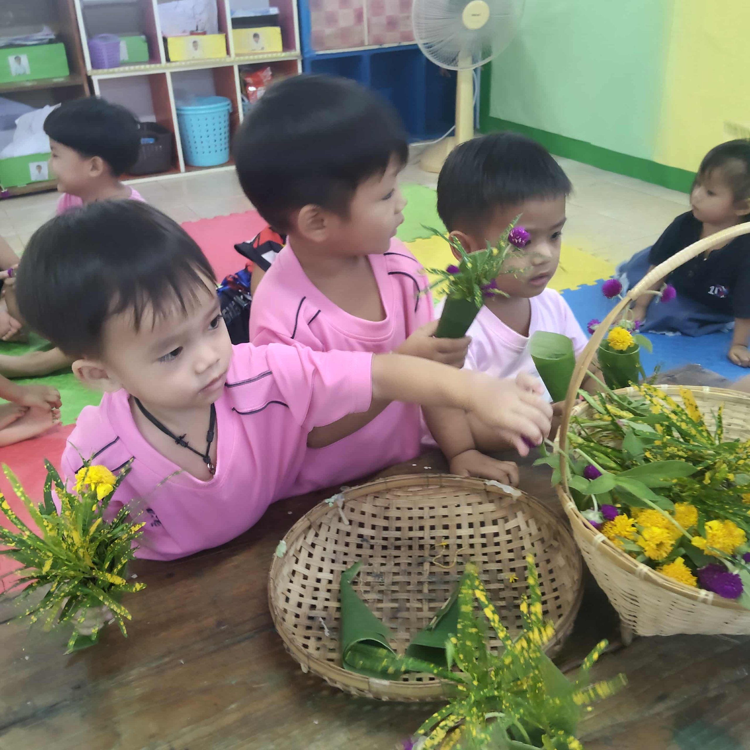 เด็กๆได้เรียนรู้ สถานที่ต่างๆในชุมชน และร่วมกันทำกิจกรรมประดิษฐ์กรวยดอกไม้เพื่อไปบูชาพระที่วัด