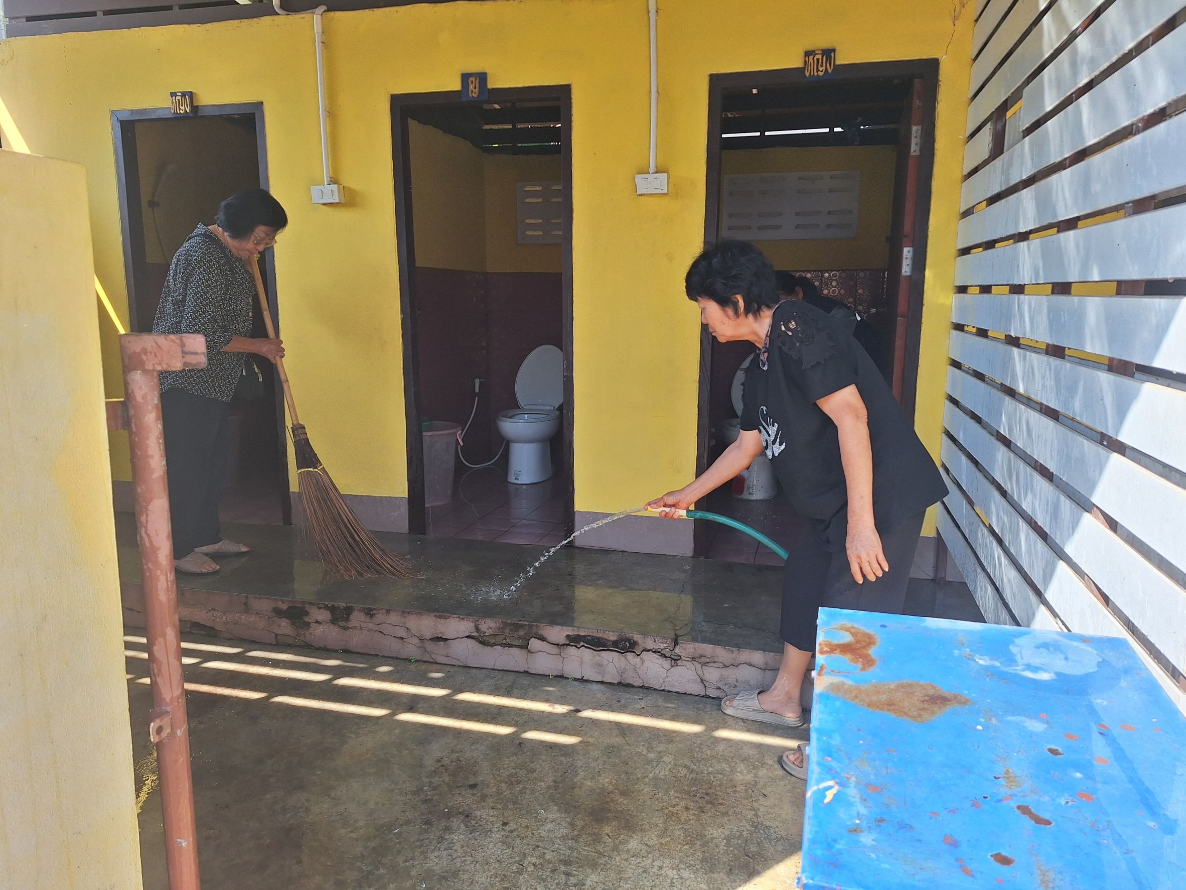 – กลุ่มสตรีทำความสะอาดห้องน้ำวัด