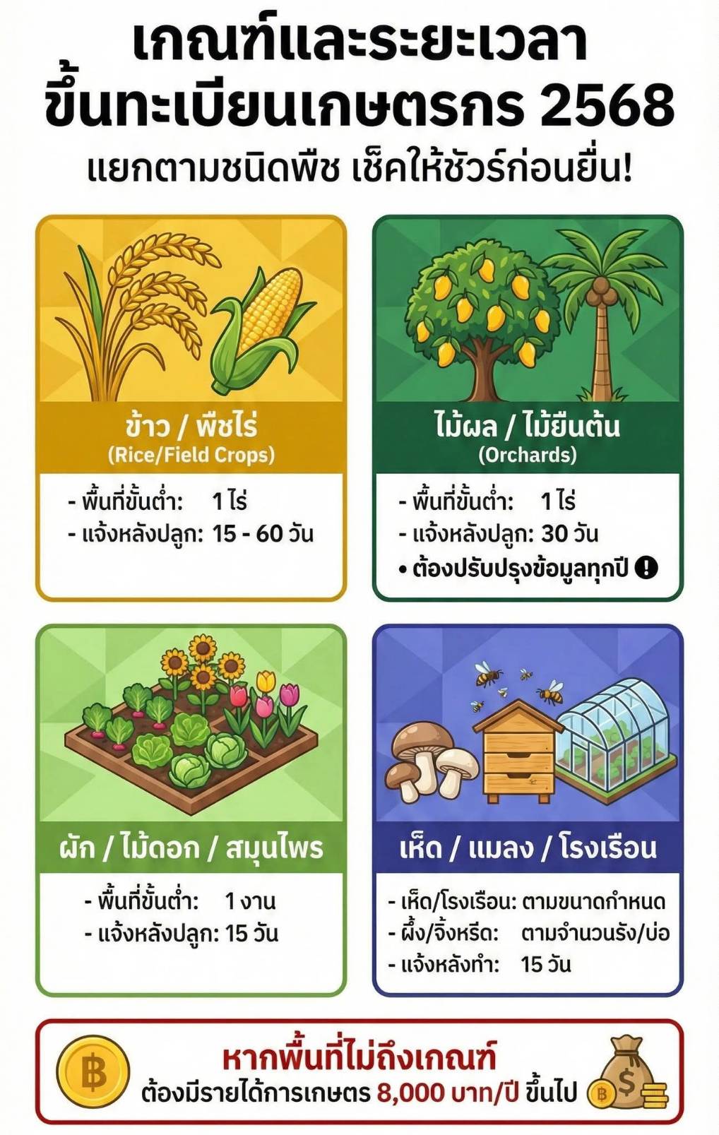 7) วันที่ 20 ธันวาคม พ.ศ. 2568 ได้เผยแพร่ข้อมูลด้านการเกษตร เรื่อง เกณฑ์และระยะเวลาขึ้นทะเบียนเกษตรกร 2568