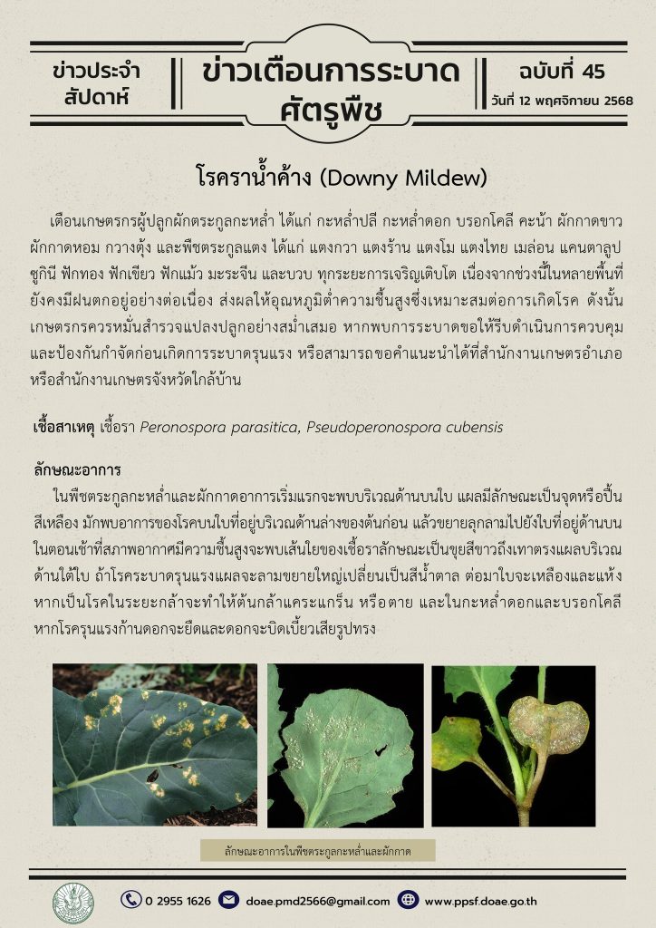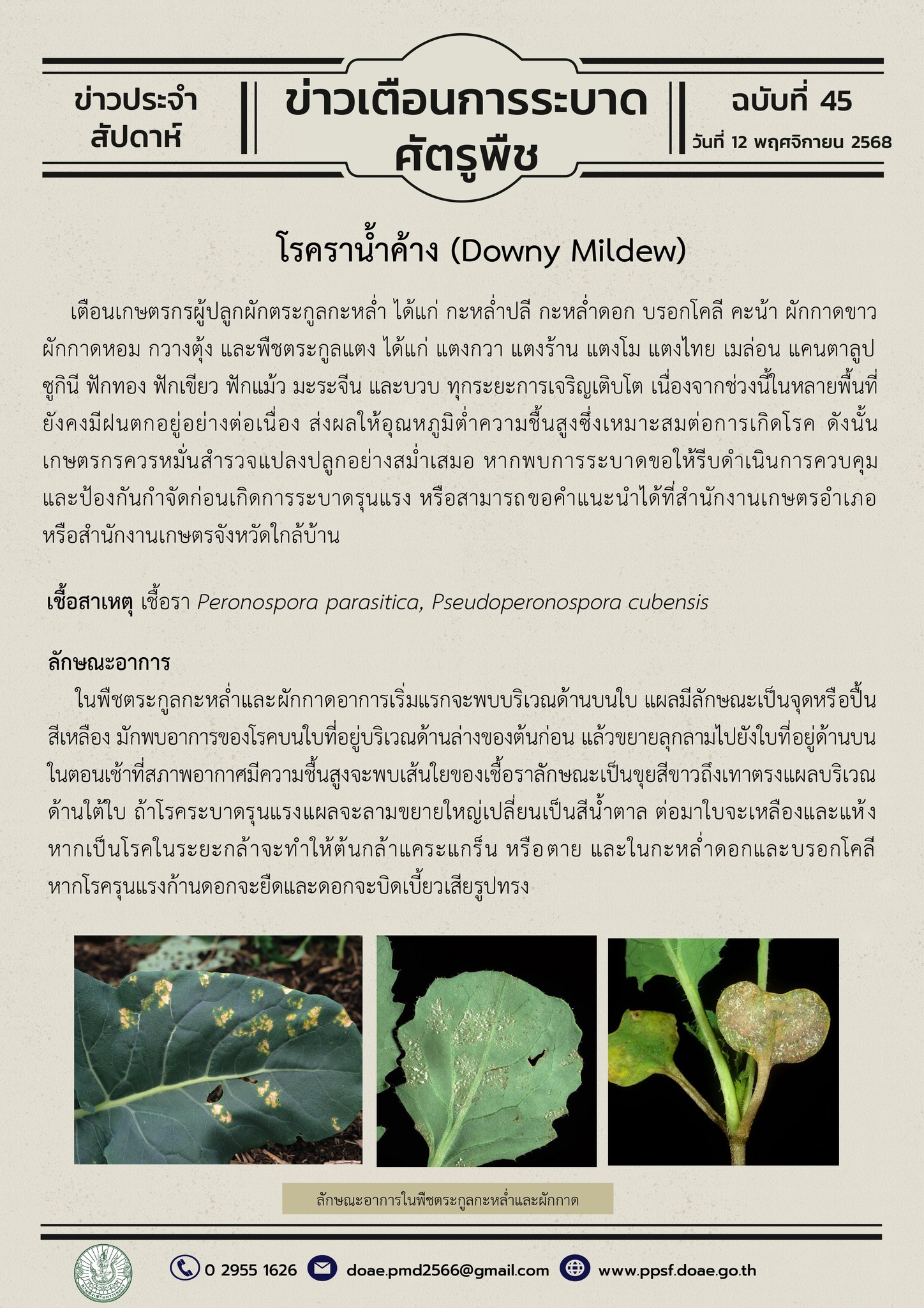 6) วันที่ 19 ธันวาคม พ.ศ. 2568 ได้เผยแพร่ข้อมูลด้านการเกษตร เรื่อง โรคราน้ำค้าง (Downy Mildew) เตือนเกษตรกรผู้ปลูกผักตระกูลกะหล่ำ