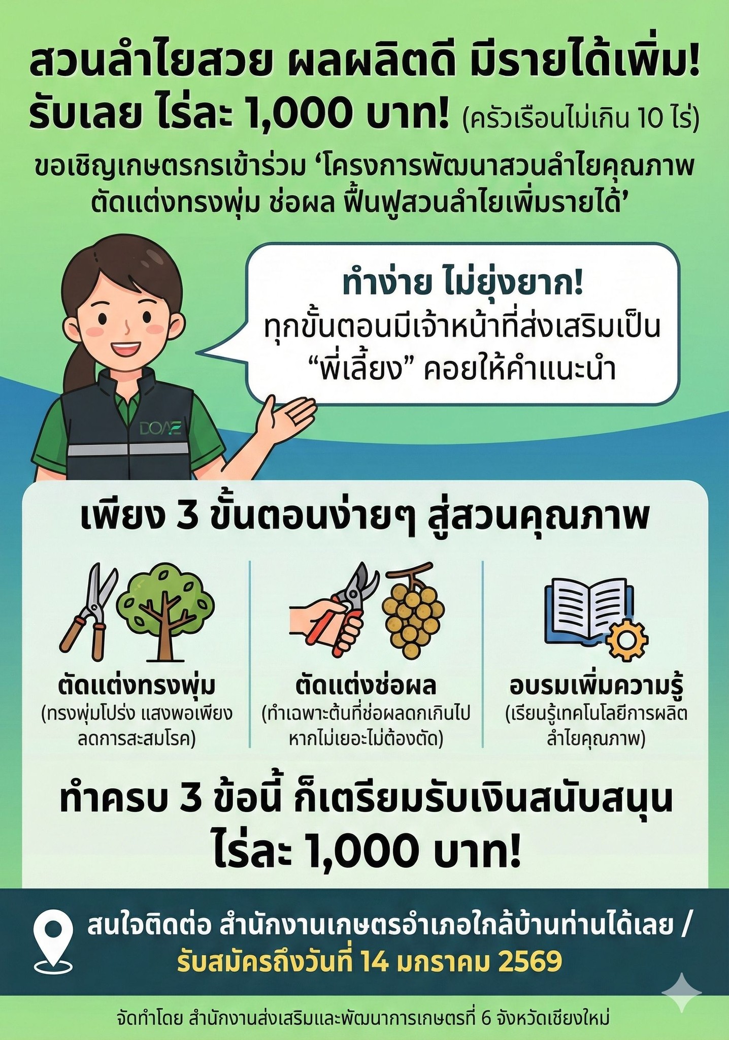 1) วันที่ 11 ธันวาคม พ.ศ. 2568 ได้เผยแพร่ข้อมูลด้านการเกษตร เรื่อง โครงการพัฒนาสวนลำไยคุณภาพตัดแต่งทรงพุ่ม/ช่อผล ฟื้นฟูสวนลำไย เพื่อเพิ่มรายได้ ขยายเวลารับสมัคร เปิดรับสมัครเข้าโครงการฯ