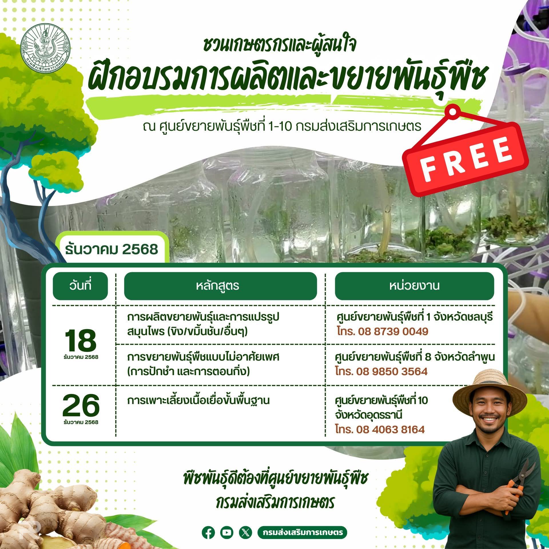 2) วันที่ 10 ธันวาคม พ.ศ. 2568 ได้เผยแพร่ข้อมูลด้านการเกษตร เรื่อง ชวนเกษตรกรและผู้สนใจฝึกอบรมการผลิตและขยายพันธุ์พืช ณ ศูนย์ขยายพันธุ์พืชที่ 1 – 10 กรมส่งเสริมการเกษตร
