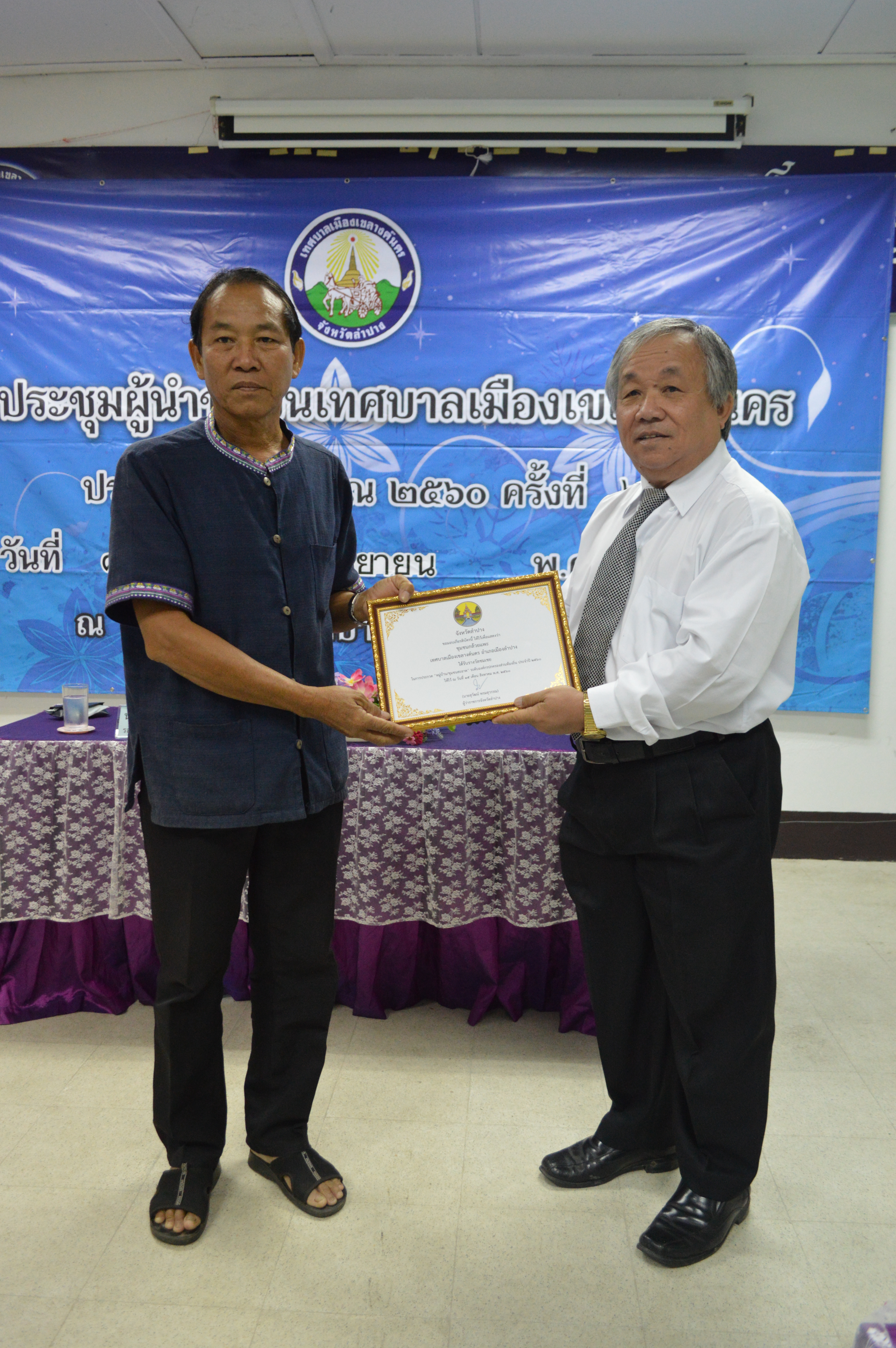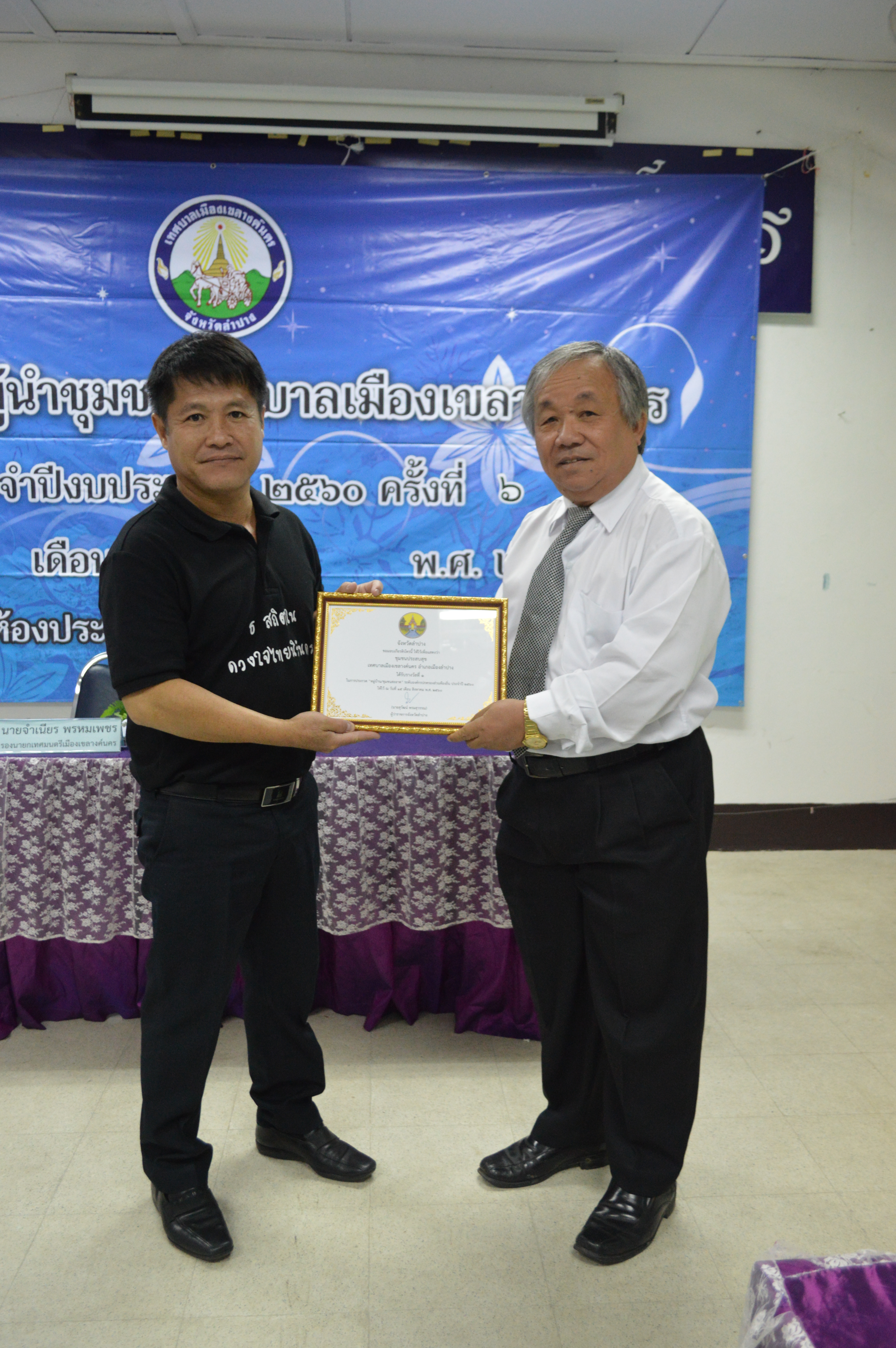 วันนี้วันที่ 8 กันยายน 2560 เวลา 09.00 น.นายไพฑูรย์ โพธิ์ทอง นายกเทศมนตรีเมืองเขลางค์นคร มอบหมายให้นายจำเนียร พรหมเพชร รองนายกเทศมนตรีเมืองเขลางค์นคร เป็นผู้มอบเกียรติบัตรให้แก่ชุมชนในเขตตำบลกล้วยแพะที่เข้ารับการคัดเลือก “ชุมชนสะอาด”ระดับอำเภอเมืองลำปาง ตามโครงการ “จังหวัดลำปางสะอาด”กับ สำนักงานส่งเสริมการปกครองท้องถิ่นจังหวัดลำปาง จำนวน 5 ชุมชน ณ ห้องประชุมเทศบาลเมืองเขลางค์นคร (โรงเรียนบ้านดอนตันเดิม) ดังนี้