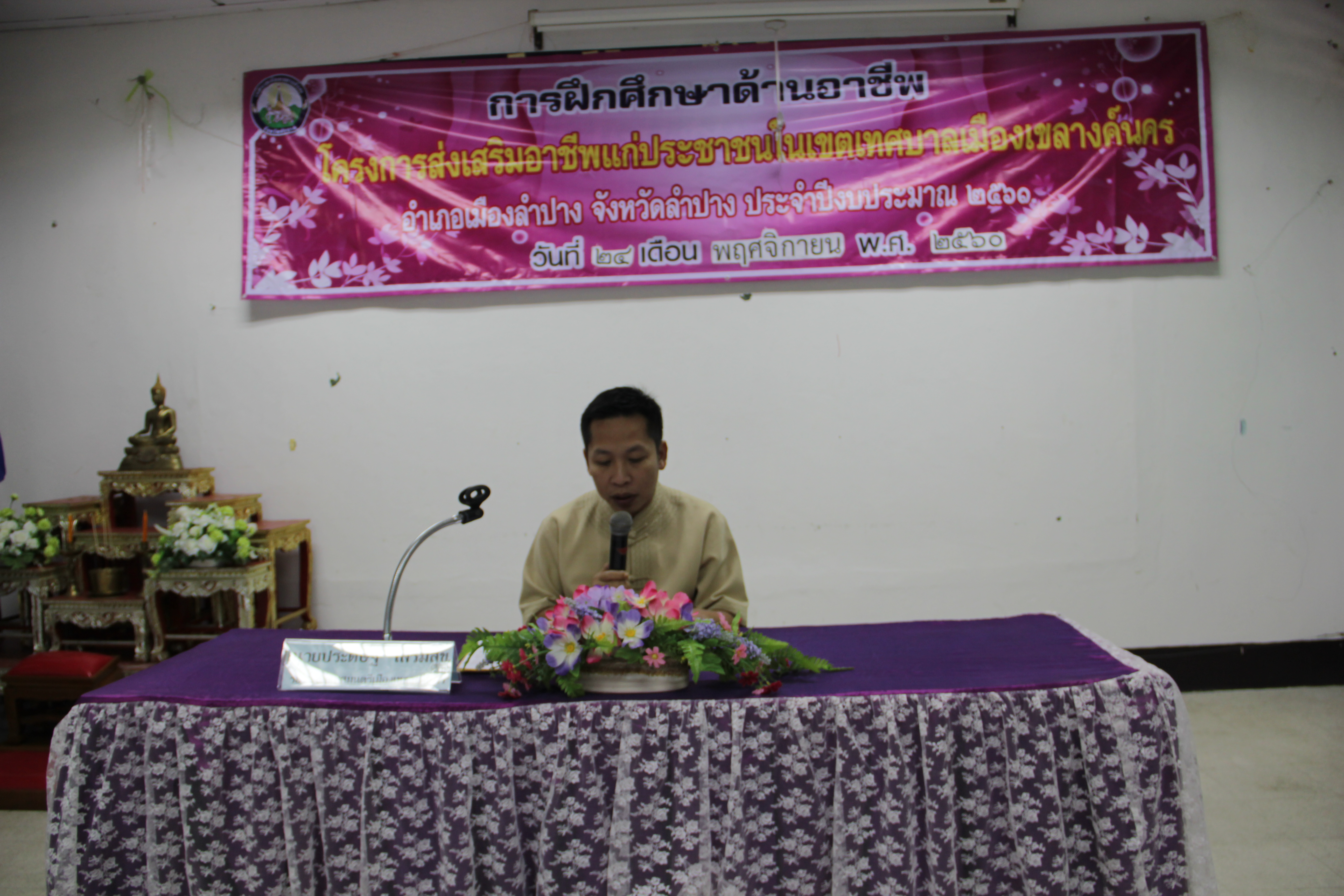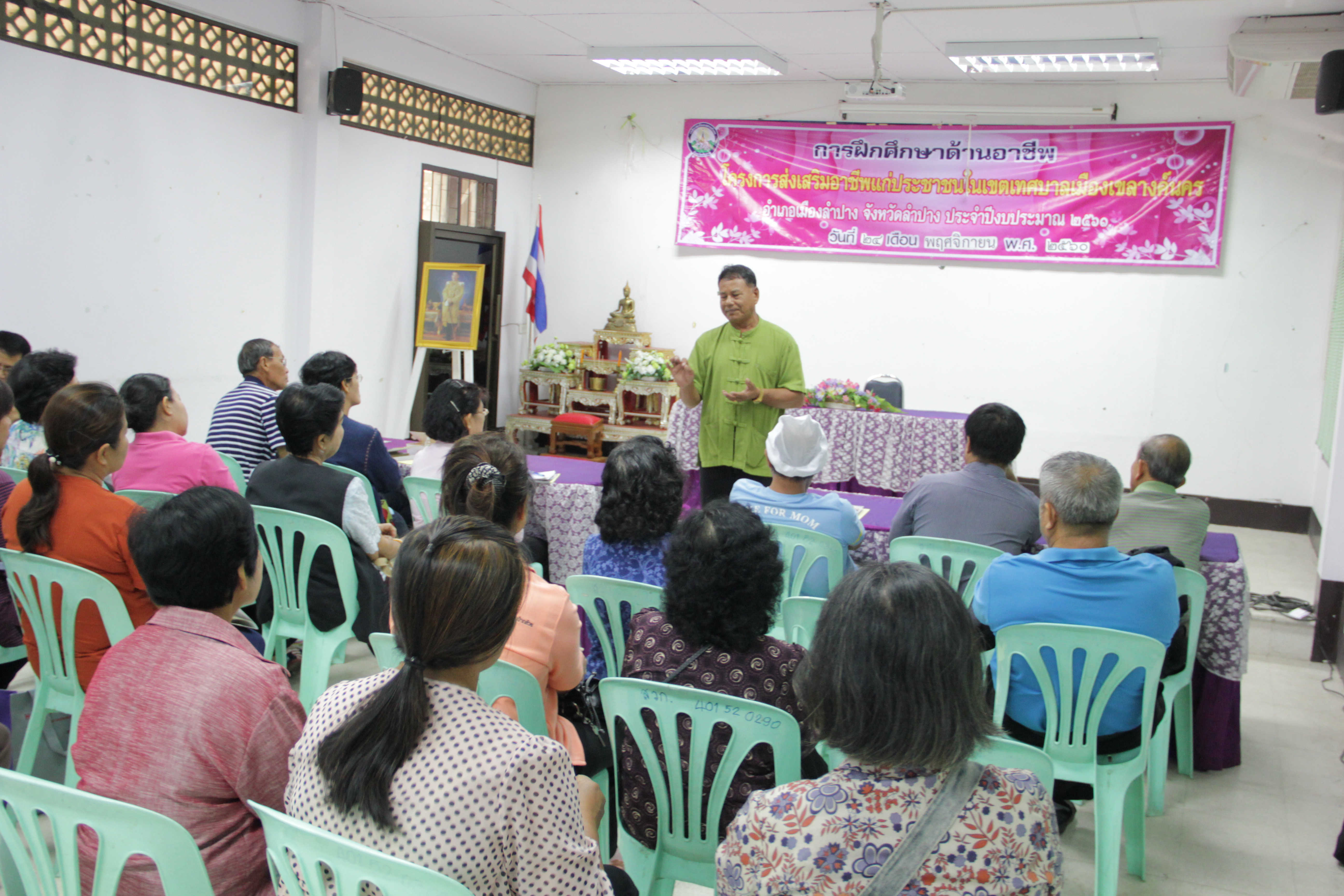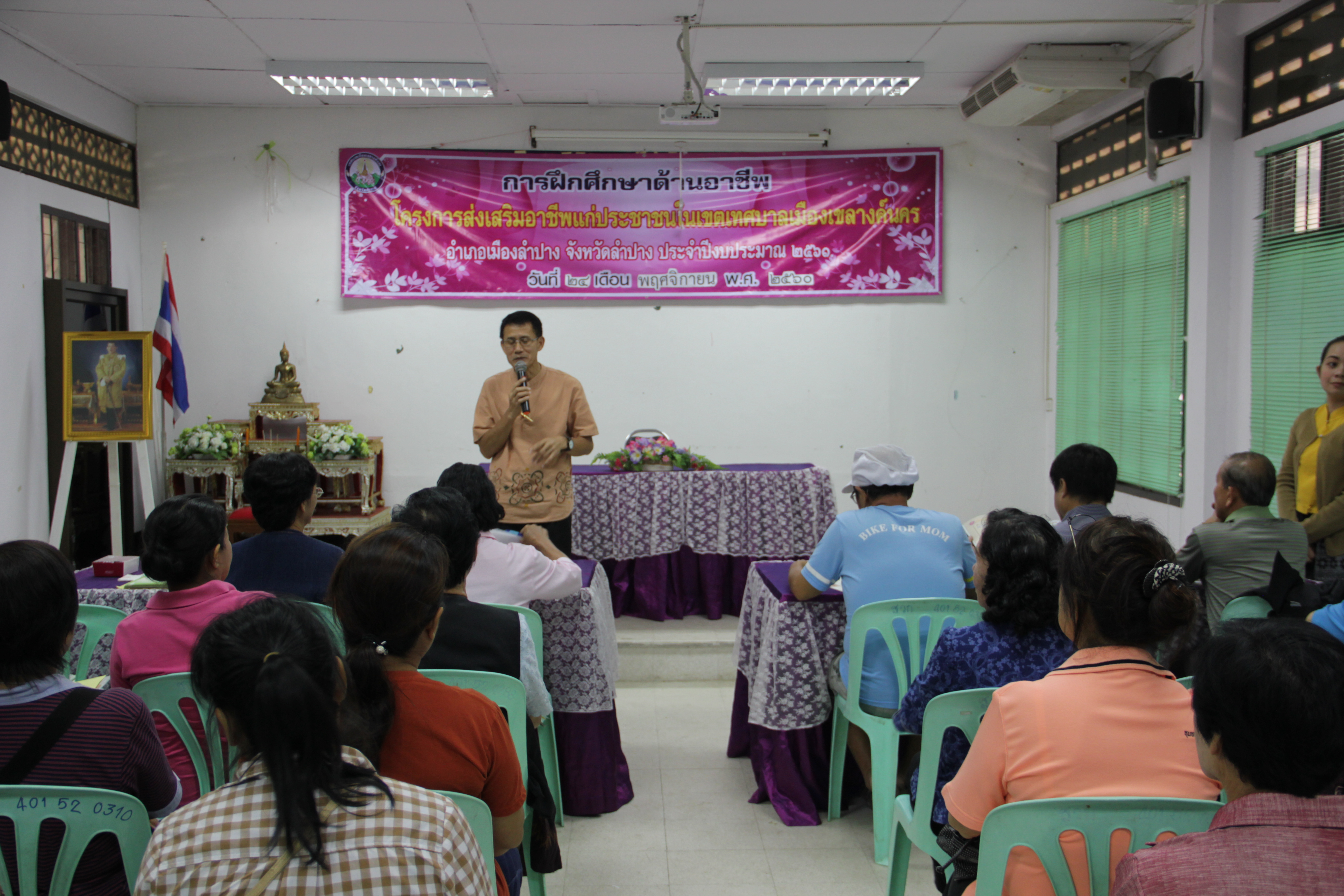 วันที่ 24 พฤศจิกายน 2560 เวลา 09.00 น.นายประดิษฐ์ เสริมสุข รองนายกเทศมนตรีเมืองเขลางค์นคร เป็นประธานในพิธีเปิดการฝึกอบรม “การแปรรูปสินค้าเกษตร การทำน้ำใบหม่อนและการทำข้าวเม่า” ตามโครงการส่งเสริมอาชีพให้แก่ประชาชนในเขตเทศบาลเมืองเขลางค์นคร ประจำปี 2561 และได้รับเกียรติจากนายประสงค์ เรือนสอน รองปลัดเทศบาลเมืองเขลางค์นคร ร่วมพบปะพูดคุย และให้แนวทางพื้นฐานการพัฒนาสินค้าที่ให้เกิดเอกลักษณ์เพื่อให้สามารถต่อยอดสร้างมูลค่าสินค้าในชุมชน โดยได้รับความอนุเคราะห์วิทยากร คือ นายประเสริฐ ประกอบกิจ เป็นผู้บรรยาย สาธิต และฝึกปฏิบัติ การทำน้ำใบหม่อน และการการทำข้าวเม่า ณ ห้องประชุมเทศบาลเมืองเขลางค์นคร โรงเรียนบ้านดอนตัน (เดิม) หมู่ที่ 9