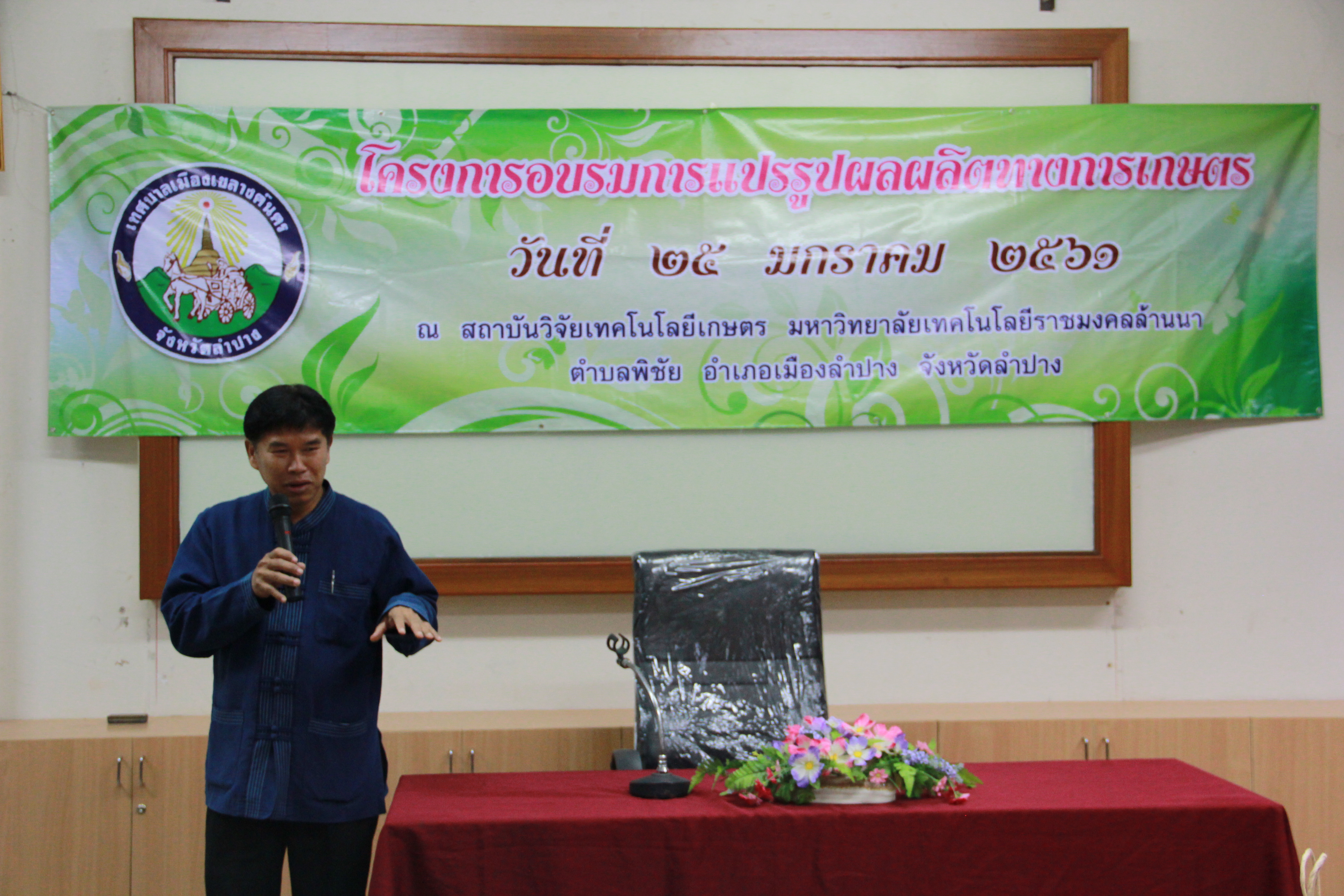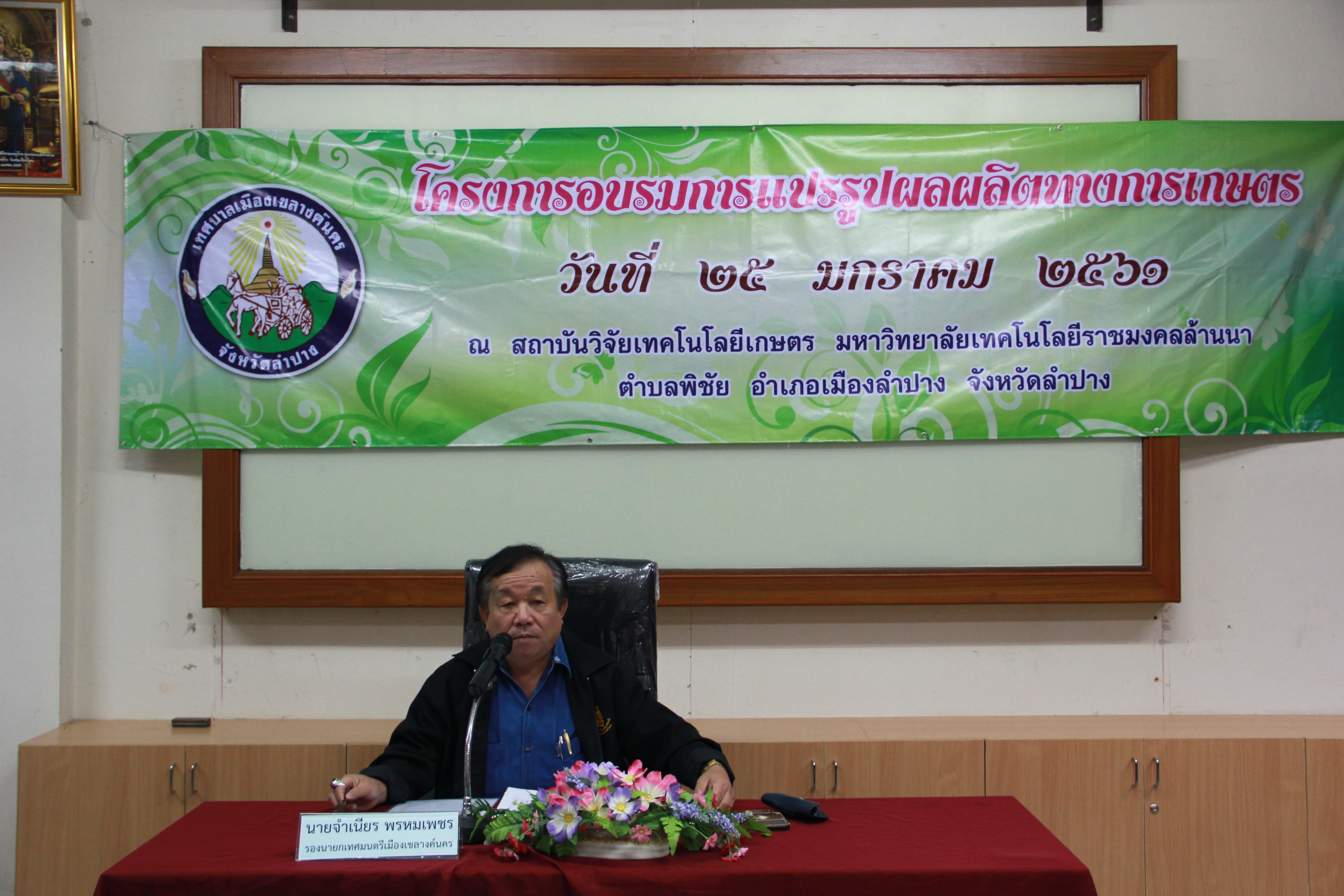 วันที่ 25 มกราคม 2561 เวลา 09.00 น. นายไพฑูรย์ โพธิ์ทอง นายกเทศมนตรีเมืองเขลางค์นคร มอบหมายให้นายจำเนียร พรหมเพชร รองนายกเทศมนตรีเมืองเขลางค์นคร เป็นประธานในพิธีเปิดโครงการอบรมแปรรูปผลผลิตทางการเกษตร โดยมีหัวหน้าส่วนราชการร่วมเป็นเกียรติในพิธีเปิด และได้รับเกียรติจากผู้ช่วยศาสตราจารย์ ดร.อรุณ โสตถิกุล ผู้อำนวยการสถาบันวิจัยเทคโนโลยีการเกษตร มหาวิทยาลัยเทคโนโลยีราชมงคลล้านนา ร่วมให้การต้อนรับเกษตรกรผู้เข้ารับการอบรม อีกทั้งยังไดัรับความอนุเคราะห์วิทยากร ดร. ภัทราภรณ์ ศรีสมรรถการ และคณะร่วมบรรยายให้ความรู้เรื่อง “ผักเชียงดา สมุนไพรไทย” และการฝึกปฏิบัติ “การทำชาผักเชียงดา และการทำผักเชียงดาแคปซูล” เพื่อให้เกษตรกรในเขตเทศบาลเมืองเขลางค์นครได้มีทางเลือกและเทคนิคในการแปรรูปผลผลิตทางการเกษตรให้เพิ่มมูลค่าของผลผลิตและสามารถนำไปประกอบเป็นอาชีพได้ต่อไป ณ สถาบันวิจัยเทคโนโลยีเกษตร มหาวิทยาลัยราชมงคลล้านนา ตำบลพิชัย อำเภอเมืองลำปาง