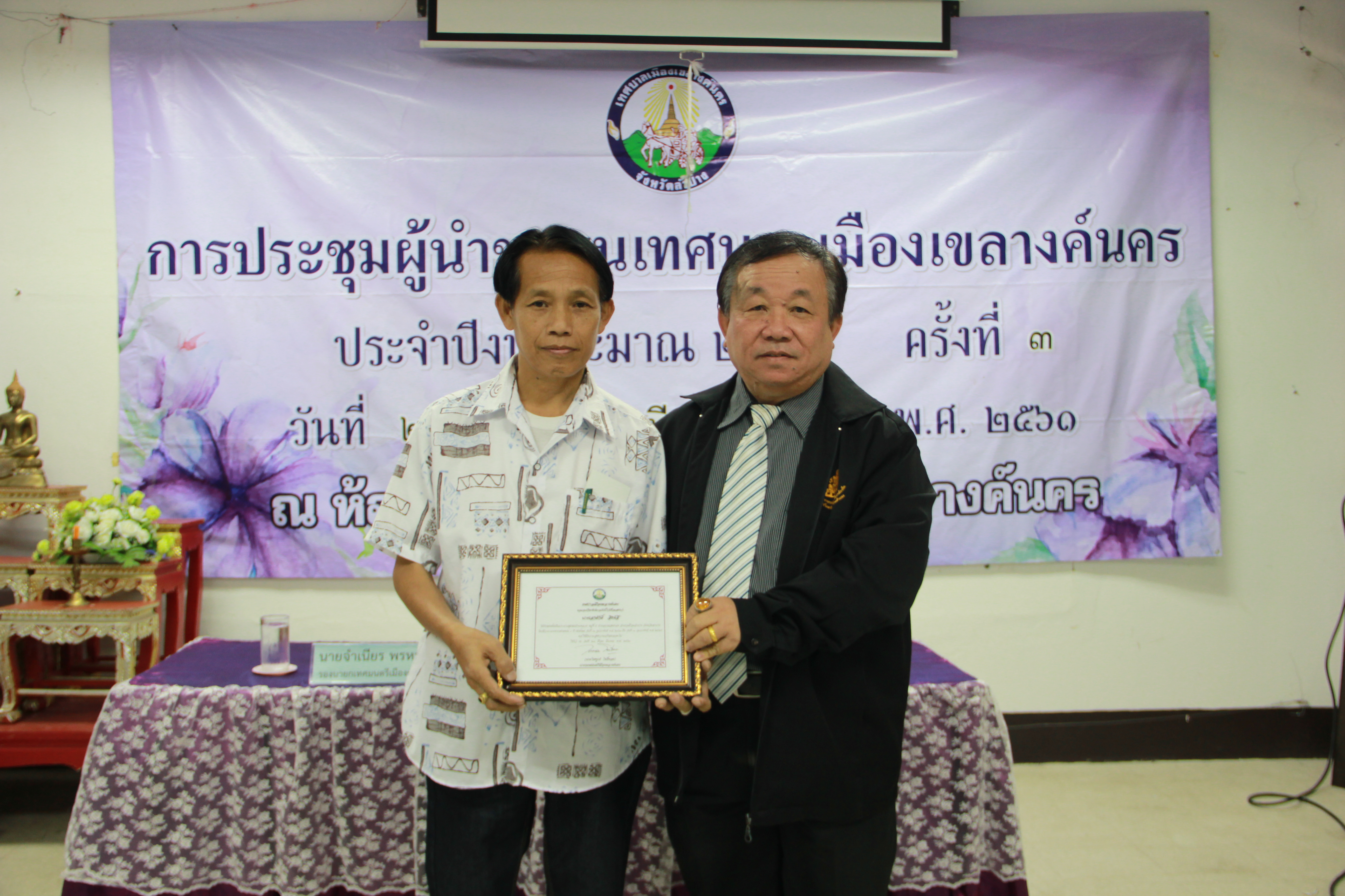 วันที่ 23 มีนาคม 2561 เวลา 09.00 น. นายไพฑูรย์ โพธิ์ทอง นายกเทศมนตรีเมืองเขลางค์นคร มอบหมายให้นายจำเนียร พรหมเพชร รองนายกเทศมนตรีเมืองเขลางค์นคร เป็นประธานในการประชุมผู้นำชุมชน ครั้งที่ 3/2561 โดยมีคณะผู้บริหาร สมาชิกสภาเทศบาล และหัวหน้าส่วนราชการร่วมเป็นเกียรติ ในการประชุมมีการมอบเกียรติบัตรให้กับประธานชุมชนคนใหม่ เพื่อเป็นขวัญกำลังใจในการปฏิบัติหน้าที่ คือ ชุมชนบ้านหลวง ตำบลปงแสนทอง ได้แก่ นายเสกศักดิ์ สิงห์สี โดยมีสมาชิกสภาเทศบาล หัวหน้าส่วนราชการ เข้าร่วมการประชุม นอกจากนั้นในที่ประชุมยังมีการแลกเปลี่ยนความคิดเห็นในเรื่องต่างๆระหว่างเทศบาลเมืองเขลางค์นครกับชุมชน เพื่อประโยชน์ต่อประชาชนในชุมชนต่อไป ณ ห้องประชุมเทศบาลเมืองเขลางค์นคร (โรงเรียนบ้านดอนตันเดิม) หมู่ที่ 9 ตำบลชมพู อำเภอเมืองลำปาง จังหวัดลำปาง
