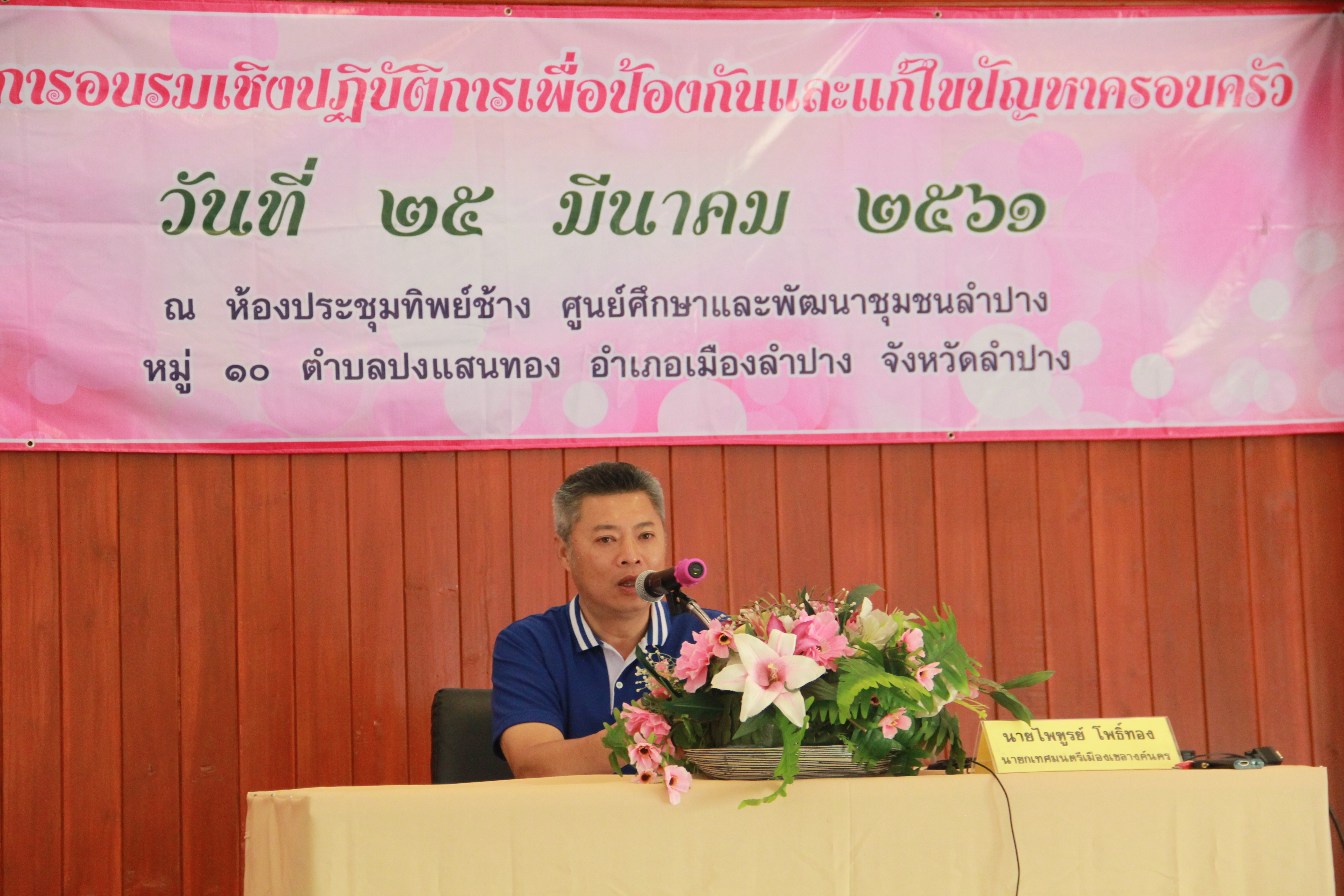 วันที่ 25 มีนาคม 2561 เวลา 09.00 น. นายไพฑูรย์ โพธิ์ทอง นายกเทศมนตรีเมืองเขลางค์นคร เป็นประธานในพิธีเปิดการอบรมตามโครงการอบรมเชิงปฏิบัติการเพื่อป้องกันและแก้ไขปัญหาครอบครัว โดยมีวัตถุประสงค์เพื่อเพื่อให้ประชาชนในเขตเทศบาลเมืองเขลางค์นครได้รับความรู้ด้านกฎหมาย และประชาชนในเขตเทศบาลเมืองเขลางค์นครสามารถนำเอาความรู้ที่ได้รับไปใช้ในการป้องกันและแก้ไขปัญหาภายในครอบครัวและชุมชนได้ โดยได้รับเกียรติจากนายสนิท เก่าพิมาย นิติกรชำนาญการ จากศาลเยาวชนและครอบครัวจังหวัดลำปางเป็นวิทยากรบรรยายให้ความรู้ และนายพันธ์ศักดิ์ คำแก้ว ประธานศูนย์เรียนรู้เพื่อครอบครัวเข้มแข็งจังหวัดลำปาง พร้อมคณะ ดำเนินการจัดกิจกรรมกลุ่มเกี่ยวกับ บทบาทหน้าที่ของครอบครัว และการสร้างความสัมพันธ์ภายในครอบครัว ณ ห้องประชุมทิพย์ช้าง ศูนย์ศึกษาและพัฒนาชุมชนลำปาง ตำบลปงแสนทอง อำเภอเมือง จังหวัดลำปาง
