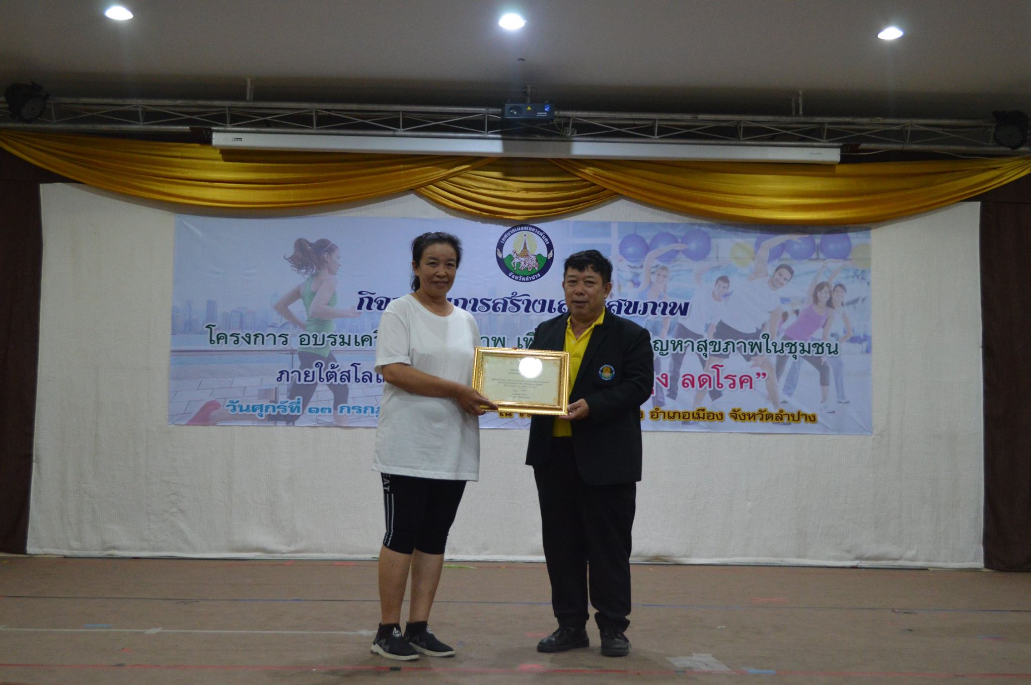 และเวลา 15.00 น. นายไพฑูรย์ โพธิ์ทอง นายกเทศมนตรีเมืองเขลางค์นคร มอบหมายให้นายธาราเงิน จันทร์คำ รองนายกเทศมนตรีเมืองเขลางค์นคร เป็นประธานในพิธีปิดและมอบเกียรติบัตรให้กับทีมที่เข้าร่วมการประกวดการออกกำลังกาย แกว่งแขนพิชิตอ้วน ลดพุงลดโรค ในการดำเนินกิจกรรม สร้างเสริมสุขภาพ พิชิตอ้วน ลดพุง ลดโรค ตามโครงการอบรมเครือข่ายสุขภาพในชุมชน โดยสรุปผลการประกวด ดังนี้