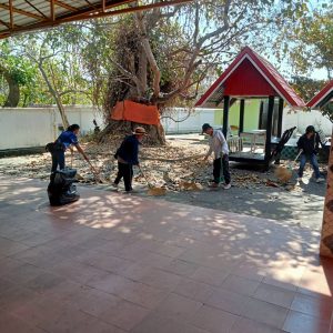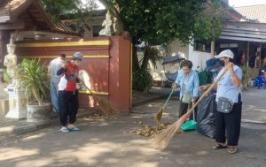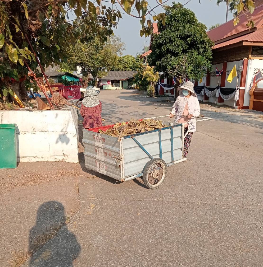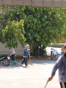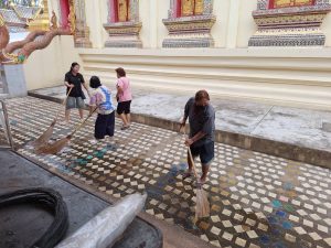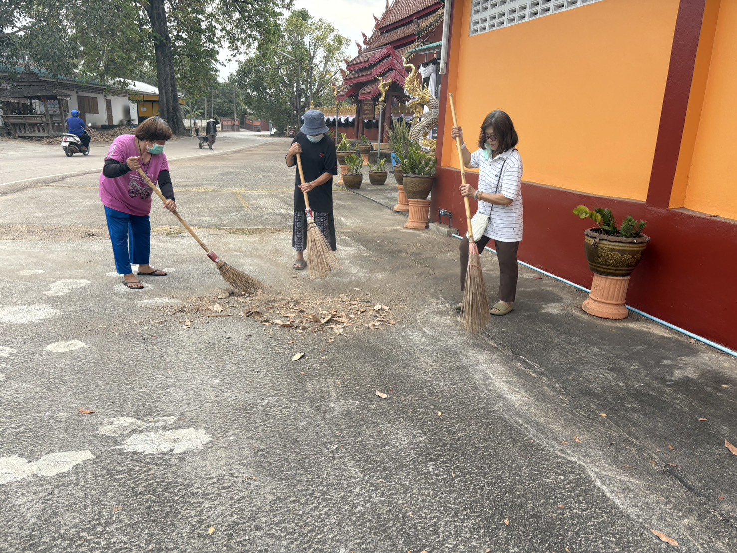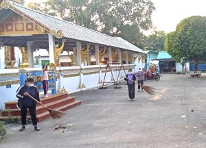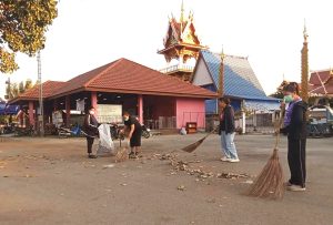 – กลุ่มสตรีทำความสะอาดลานวัด
