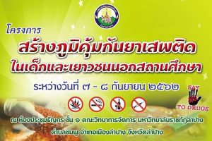 เทศบาลเมืองเขลางค์นคร กำหนดดำเนินโครงการสร้างภูมิคุ้มกันยาเสพติดในเด็กและเยาวชนนอกสถานศึกษา ในระหว่างวันที่ 7 – 8 กันยายน 2562 ณ ห้องประชุมธัญกร ชั้น 1 คณะวิทยาการจัดการ มหาวิทยาลัยราชภัฎลำปาง โดยมีวัตถุประสงค์เพื่อให้เกิดกลไก ระบบงาน กระบวนการทำงาน สร้างภูมิคุ้มกันและป้องกันยาเสพติดในกลุ่มเยาวชนนอกสถานศึกษา และเพื่อสร้างเสริมภูมิคุ้มกันและป้องกันยาเสพติดในกลุ่มเด็กและเยาวชนนอกสถานศึกษาไม่เข้าไปเกี่ยวข้องและห่างไกลจากยาเสพติด เพื่อให้กลุ่มเยาวชนนอกสถานศึกษา ได้มีส่วนร่วมในการป้องกัน เฝ้าระวัง และแก้ไขปัญหายาเสพติดตามสถานะที่เป็นอยู่และเพื่อสร้างกระแสสังคมให้เกิดความตระหนักถึงปัญหาการแพร่ระบาดยาเสพติดในชุมชน