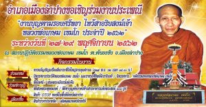 เทศบาลเมืองเขลางค์นคร ขอเชิญร่วมงานประเพณี “งานบุญตามรอยศรัทธา ไหว้สาอริยสงฆ์เจ้า หลวงพ่อเกษม เขมโก” ประจำปี 2562 ระหว่างวันที่ 27 – 29 พฤศจิกายน 2562 ณ สถานปฏิบัติธรรมหลวงพ่อเกษม เขมโก ตำบลต้นธงชัย อำเภอเมืองลำปาง จังหวัดลำปาง ภายในงานมีการอัญเชิญขบวนแห่เครื่องครัวตานสักการะ การแสดงนิทรรศการเครื่องสักการะในพระพุทธศาสนา นิทรรศการประวัติหลวงพ่อเกษม เขมโก นิทรรศการพระเครื่องหลวงพ่อเกษม เขมโก การเล่าเรื่องเมืองลำปาง พิธีสวดอุทิศส่วนกุศล สวดมาติกา บังสุกุล ทำบุญตักบาตร สวดอภิธรรม ฟังเทศน์ และปฏิบัติธรรม รวมถึงได้จัดโรงทาน เพื่ออุทิศส่วนกุศลแด่หลวงพ่อเกษม เขมโก
