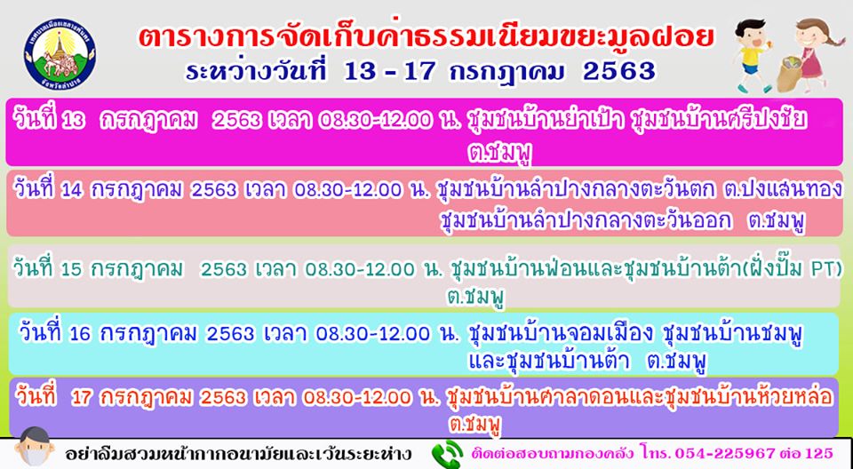 เทศบาลเมืองเขลางค์นคร ขอประชาสัมพันธ์แผนการดำเนินการออกจัดเก็บค่าธรรมเนียมเก็บและขนขยะมูลฝอยนอกสถานที่ เพื่อเป็นการให้บริการประชาชนให้ได้รับความสะดวกในการชำระค่าธรรมเนียมการจัดเก็บค่าขยะมูลฝอย จึงขอเชิญชวนผู้ที่รับบริการเก็บขยะของทางเทศบาลเมืองเขลางค์นคร ที่ต้องชำระค่าธรรมเนียมเก็บขยะมูลฝอย มาชำระค่าธรรมเนียมขยะมูลฝอย ประจำปี 2563 ระหว่างวันที่ 13-17 กรกฎาคม 2563