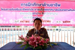 นายไพฑูรย์ โพธิ์ทอง นายกเทศมนตรีเมืองเขลางค์นคร มอบหมายให้นายประดิษฐ์ เสริมสุข รองนายกเทศมนตรีเมืองเขลางค์นคร เป็นประธานในพิธีเปิดโครงการส่งเสริมอาชีพแก่ประชาชนในเขตเทศบาลเมืองเขลางค์นคร ประจำปีงบประมาณ 2564 หลักสูตร การอบรมนวดแผนไทย ซึ่งได้รับความอนุเคราะห์จากนางภัคจิรา มุกดาแก้ว เป็นวิทยากรให้ความรู้ สาธิตและฝึกปฏิบัติการนวดแผนไทย ระหว่างวันที่ 14- 18 ธันวาคม 2563 ณ ศาลาอเนกประสงค์ชุมชนบ้านชมพู ตำบลชมพู อำเภอเมือง จังหวัดลำปาง เพื่อให้พัฒนาทักษะและส่งเสริมอาชีพให้กับประชาชน ได้เรียนรู้ในการประกอบอาชีพให้สามารถนำไปประกอบอาชีพหลักและอาชีพเสริมสร้างรายได้ให้กับครอบครัวต่อไป