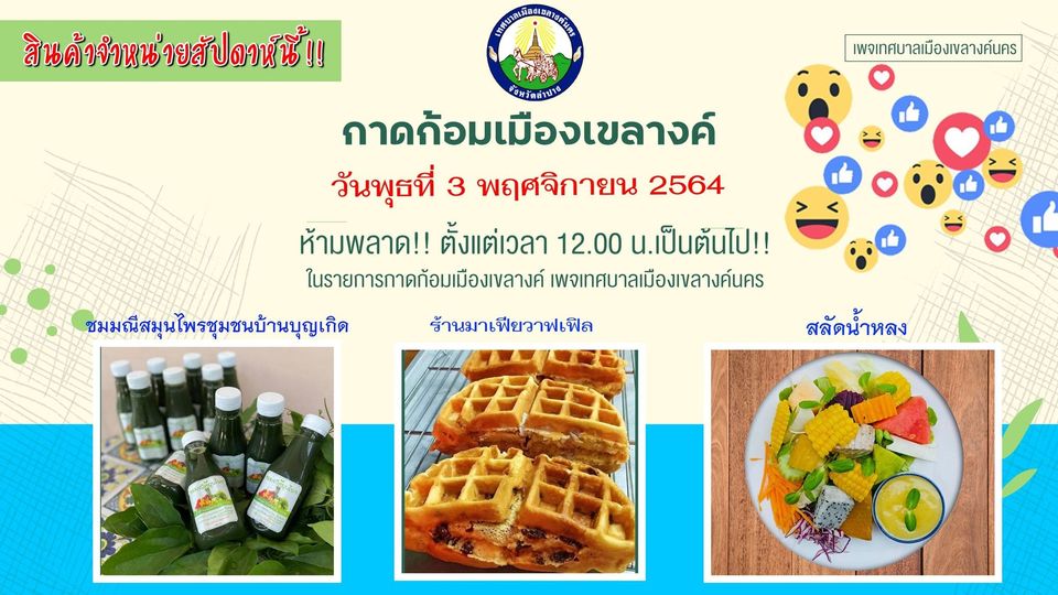 วันพุธที่ 3 พฤศจิกายน 2564 เวลา 12.00 น. เทศบาลเมืองเขลางค์นคร จัดกิจกรรมการส่งเสริมช่องทางการจำหน่ายสินค้าแก่กลุ่มอาชีพและผู้ประกอบการในเขตเทศบาลเมืองเขลางค์นคร โดยเป็นการจำหน่ายสินค้าออนไลน์ผ่านทางเพจเทศบาลเมืองเขลางค์นคร (กาดก้อมเมืองเขลางค์) อาทิเช่น