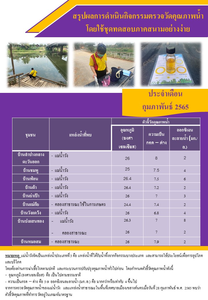 กิจกรรมตรวจวัดคุณภาพน้ำแม่น้ำวัง ประจำเดือนกุมภาพันธ์ 2565 สรุปผลการดำเนินกิจกรรมตรวจวัดคุณภาพน้ำโดยใช้ชุดทดสอบภาคสนามอย่างง่ายประจำเดือนกุมภาพันธ์ 2565 Share FacebookTwitterGoogle+ReddItWhatsAppPinterestEmail