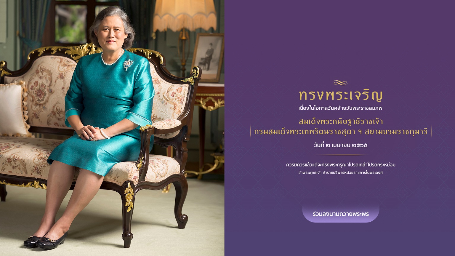 สำนักพระราชวัง ขอเชิญชวนประชาชนร่วมลงนามถวายพระพร สมเด็จพระกนิษฐาธิราชเจ้า กรมสมเด็จพระเทพรัตนราชสุดา เจ้าฟ้ามหาจักรีสิรินธร มหาวชิราลงกรณวรราชภักดีสิริกิจการิณีพีรยพัฒน รัฐสีมาคุณากรปิยชาติ สยามบรมราชกุมารี เนื่องในโอกาสวันคล้ายวันพระราชสมภพ วันที่ ๒ เมษายน ๒๕๖๕ ผ่านระบบออนไลน์ ที่เว็บไซต์หน่วยราชการในพระองค์ www.royaloffice.th ระหว่างวันที่ ๑-๓ เมษายน ๒๕๖๕