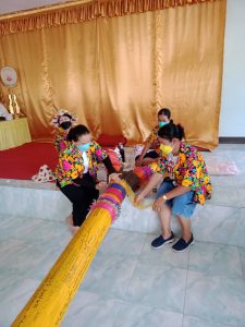 – ช่วยกันจัดเตรียมสถานที่ขนทรายเข้าวัดและสรงน้ำพระในชุมชน