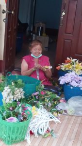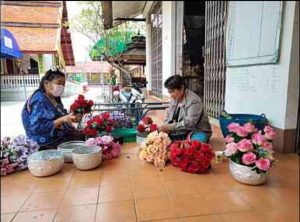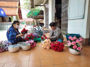 10. กลุ่มสตรีชุมชนบ้านร้อง จัดดอกไม้ตกแต่งงานฉลองหอระฆัง หอธรรม และแท่นซุ้มพระ วัดบ้านร้อง